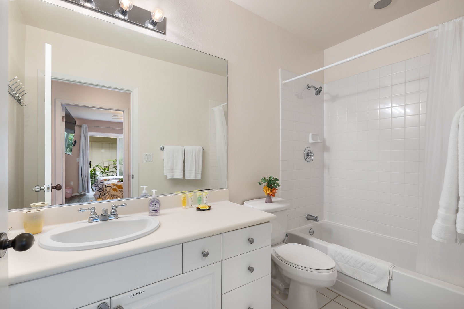 • Guest Bedroom – Two Twin XL beds, garden view, ceiling fan, access to full hall bath