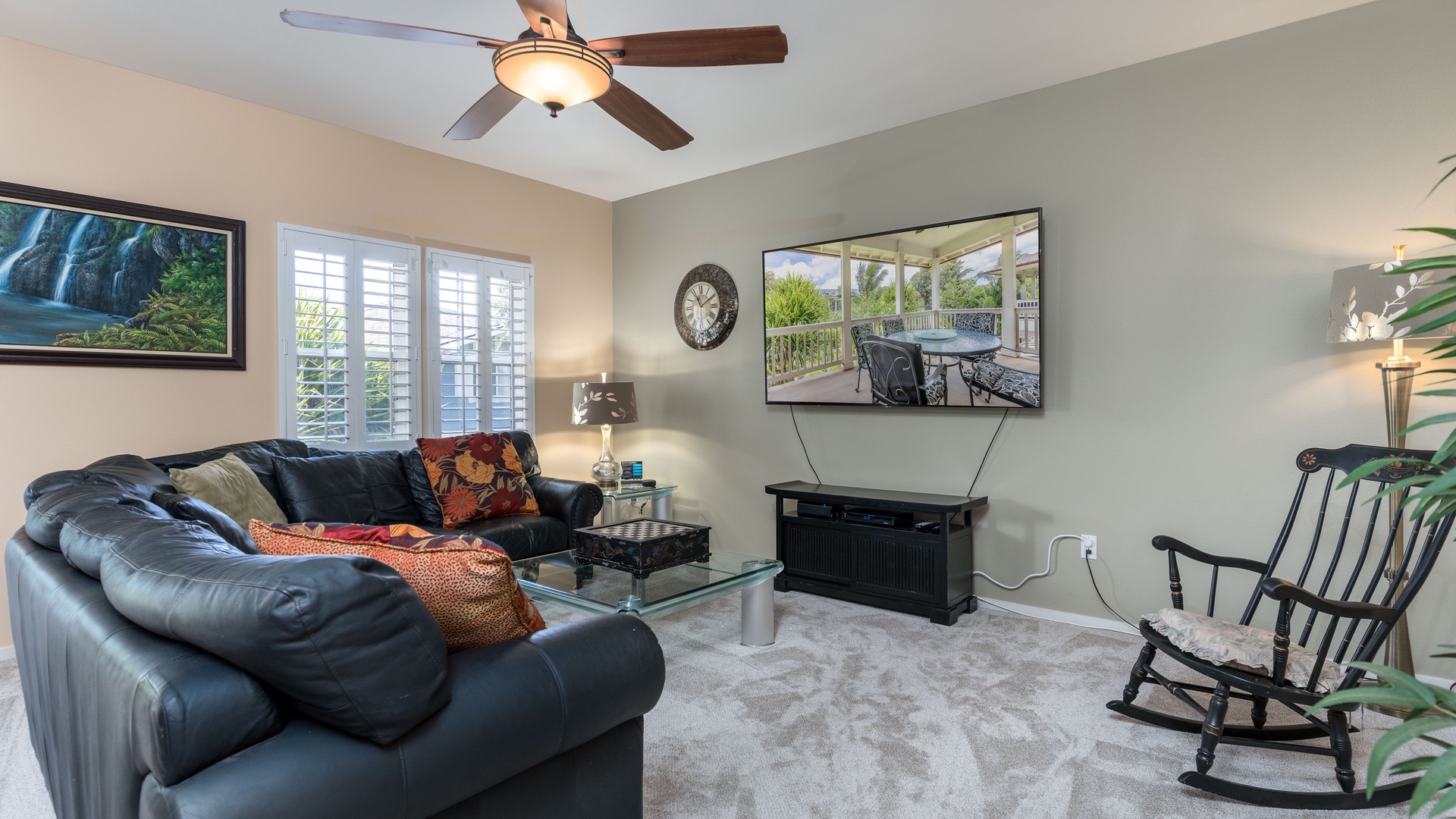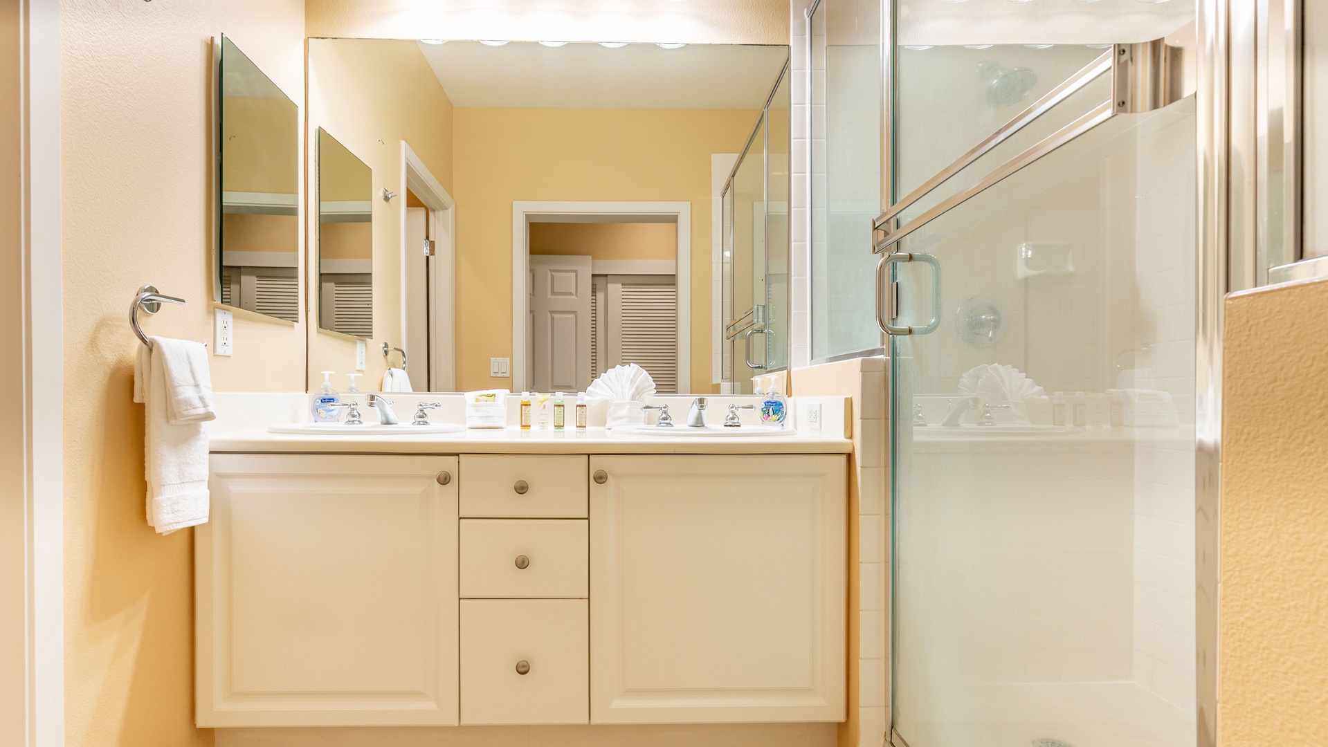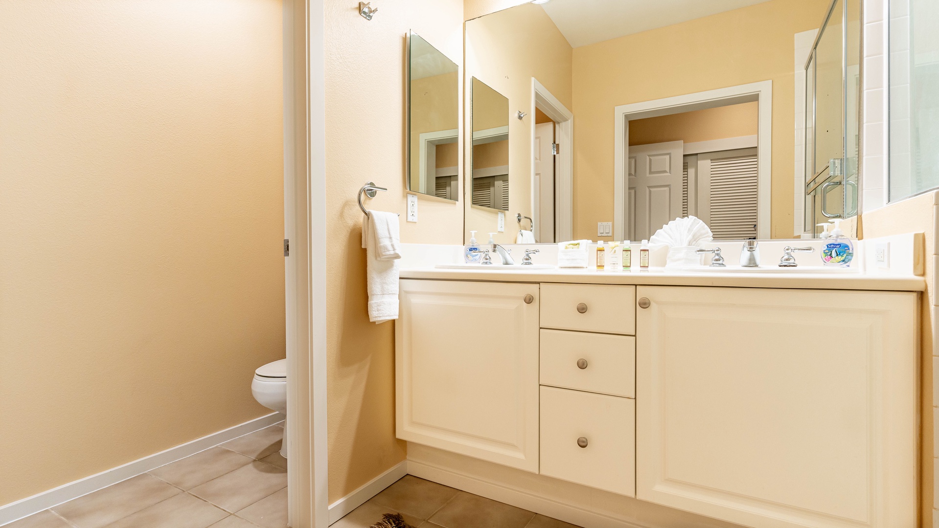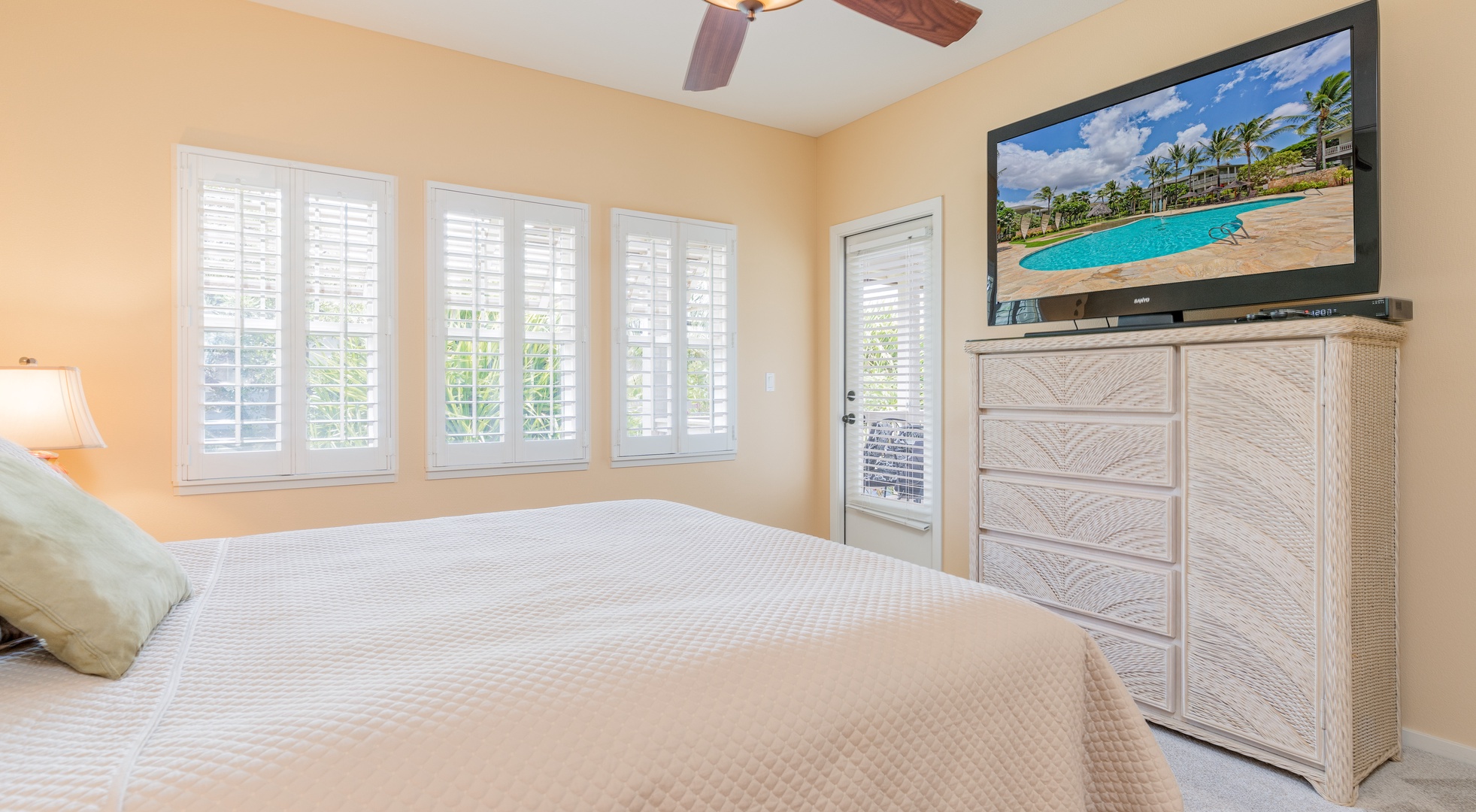 • Primary Suite – King bed, ceiling fan, Smart TV, private lanai, and ensuite bath with large walk-in shower and dual vanities.