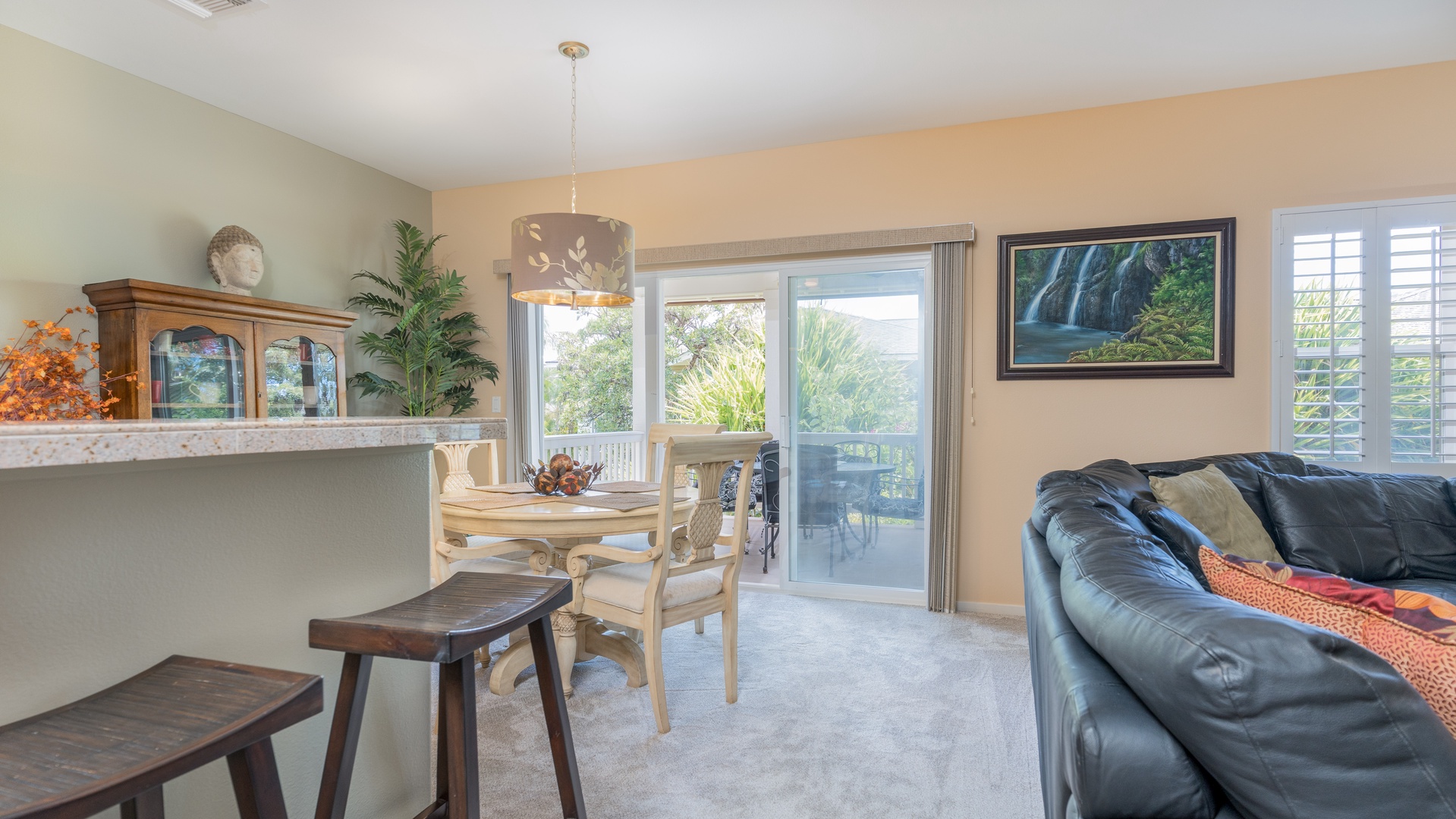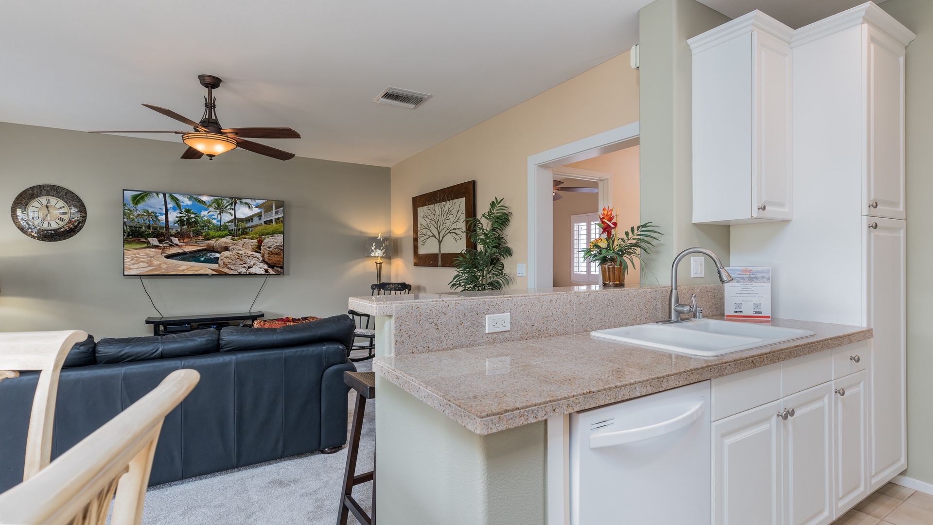 The spacious open-plan living area offers the perfect setting for both relaxation and socializing. Lounge on the plush sectional sofa as you enjoy your favorite shows on the large Smart TV, or open the sliding doors to let in cooling trade winds and the gentle sounds of island life. The adjacent dining area comfortably seats six, creating an ideal spot for family meals or evening gatherings.