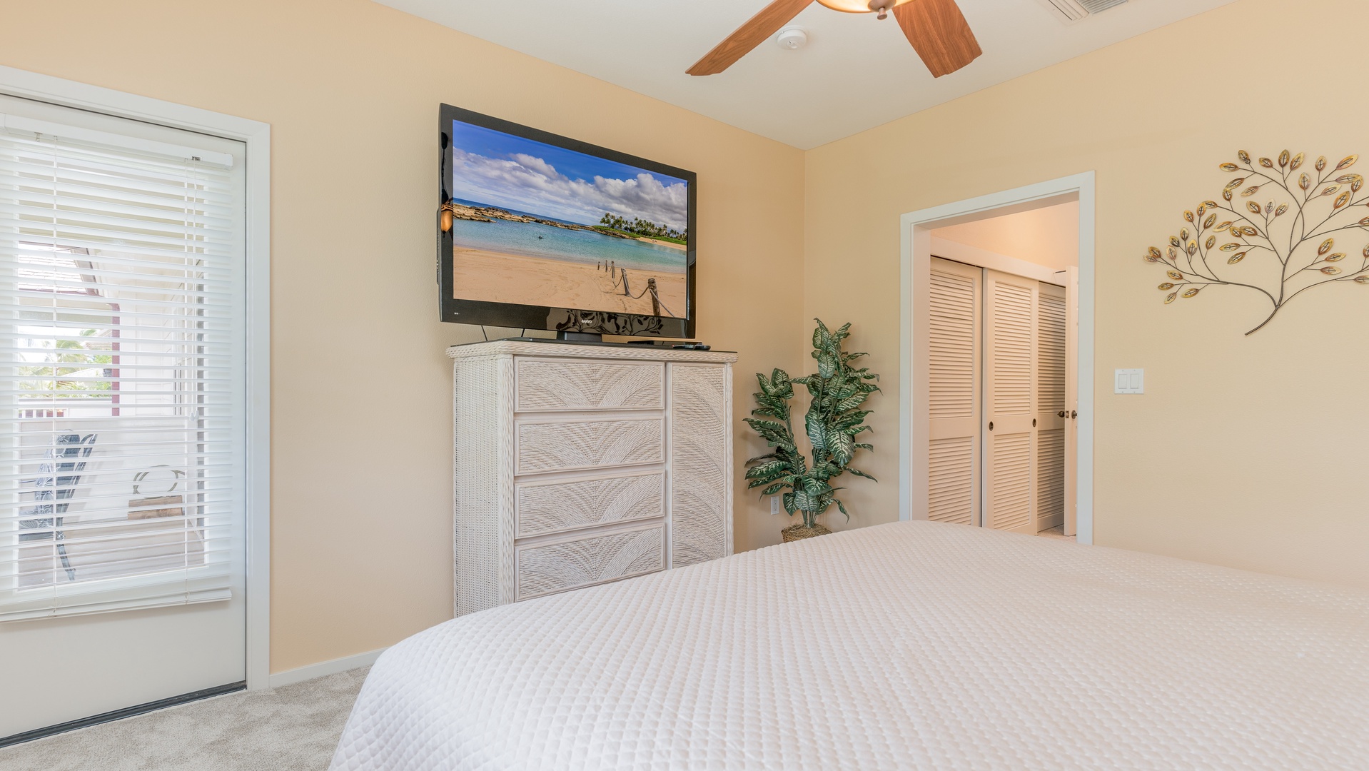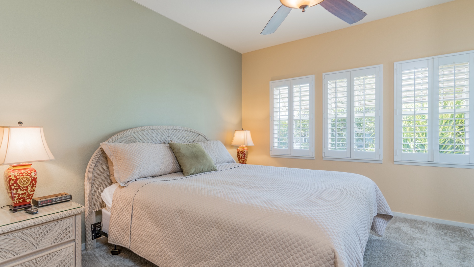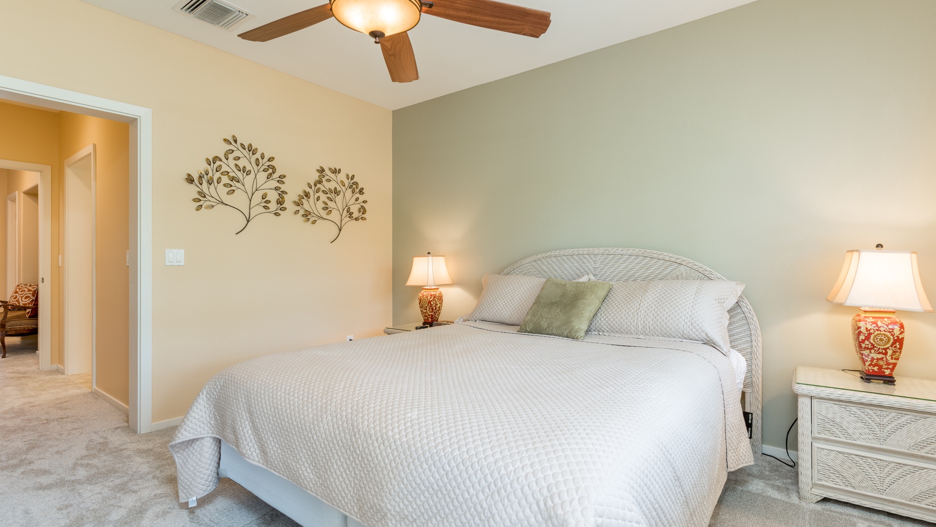 • Guest Bedroom 1 – Queen bed, Smart TV, ceiling fan, and easy access to the second full bathroom.