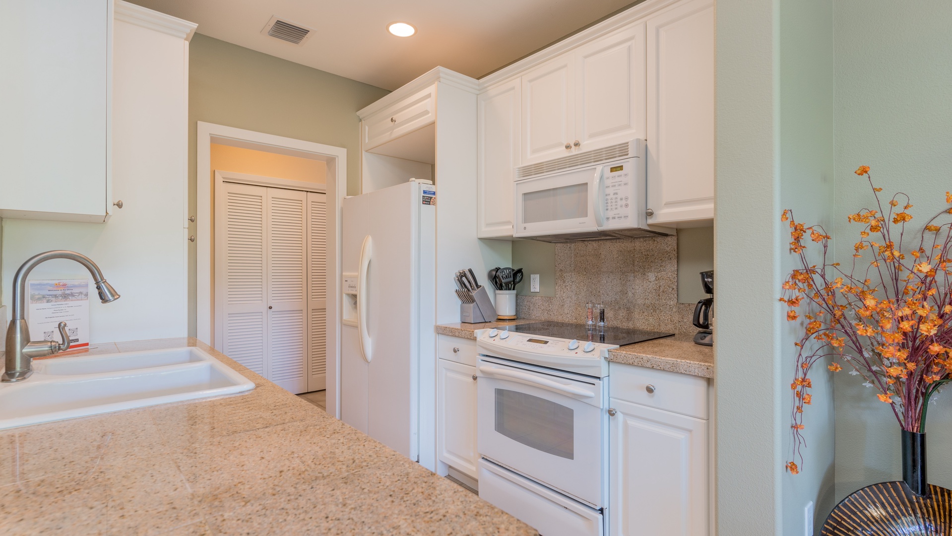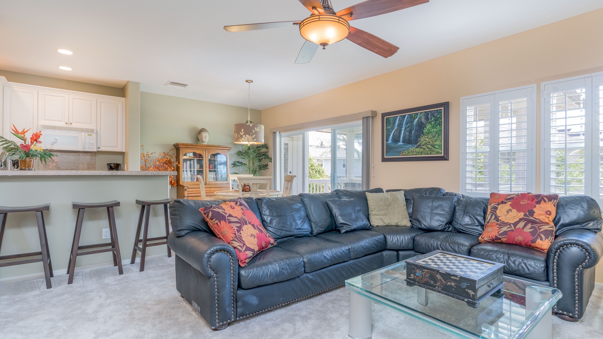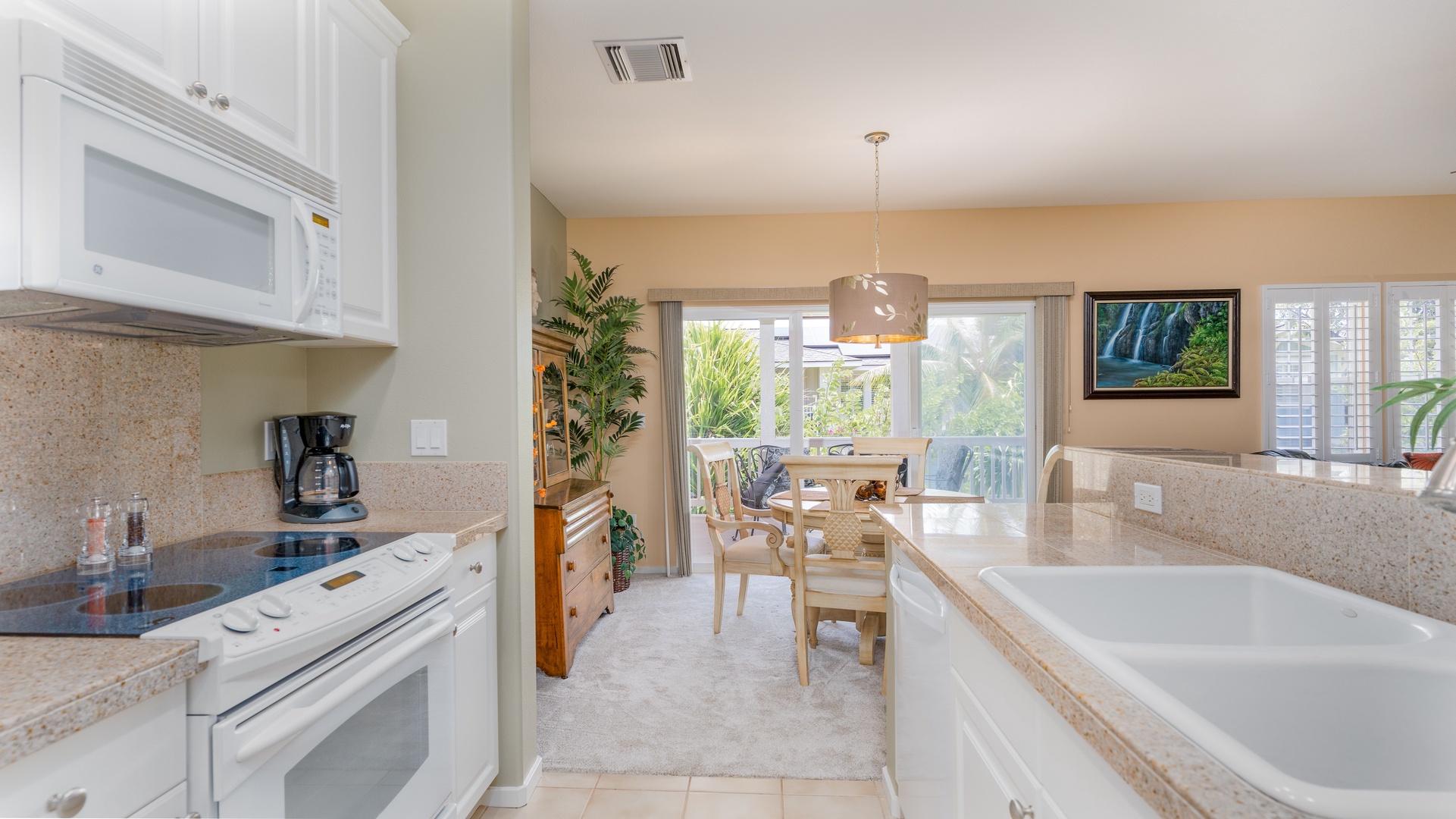 A chef’s delight, the fully equipped kitchen features sleek countertops, stainless steel appliances, a breakfast bar for casual dining, and all the cookware and utensils needed to prepare your favorite island dishes. Whether you’re making fresh fruit smoothies or a full family dinner, this kitchen has everything you need.