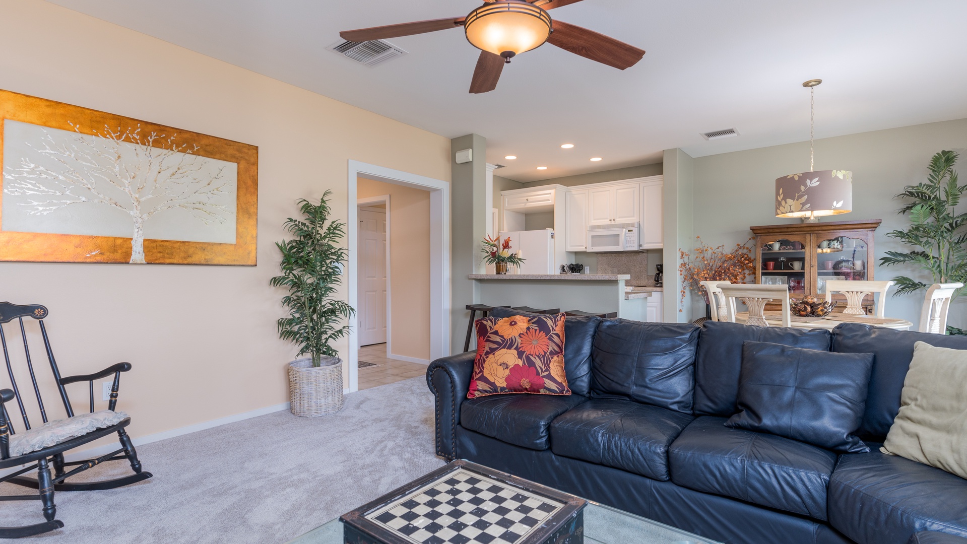 • Bright, open-concept living area with plush leather seating and a 65-inch Smart TV