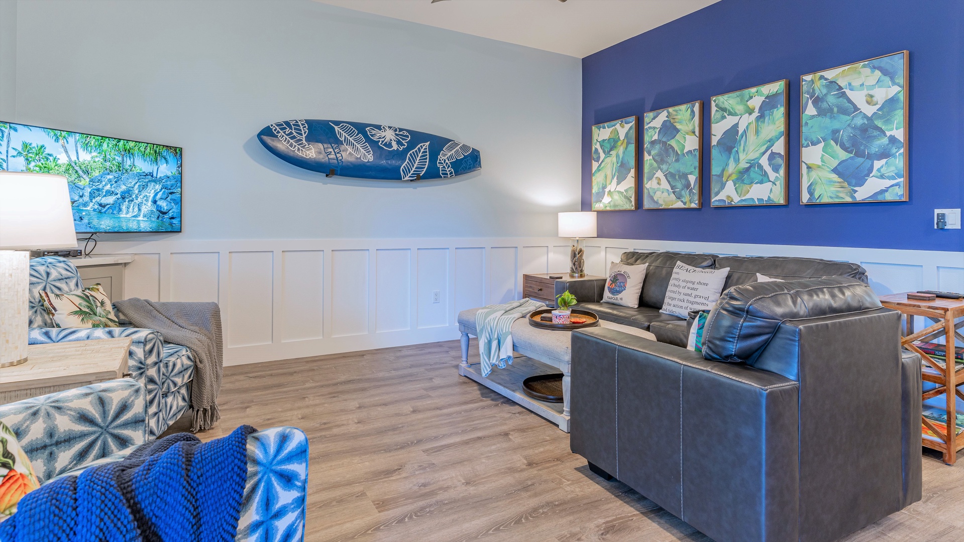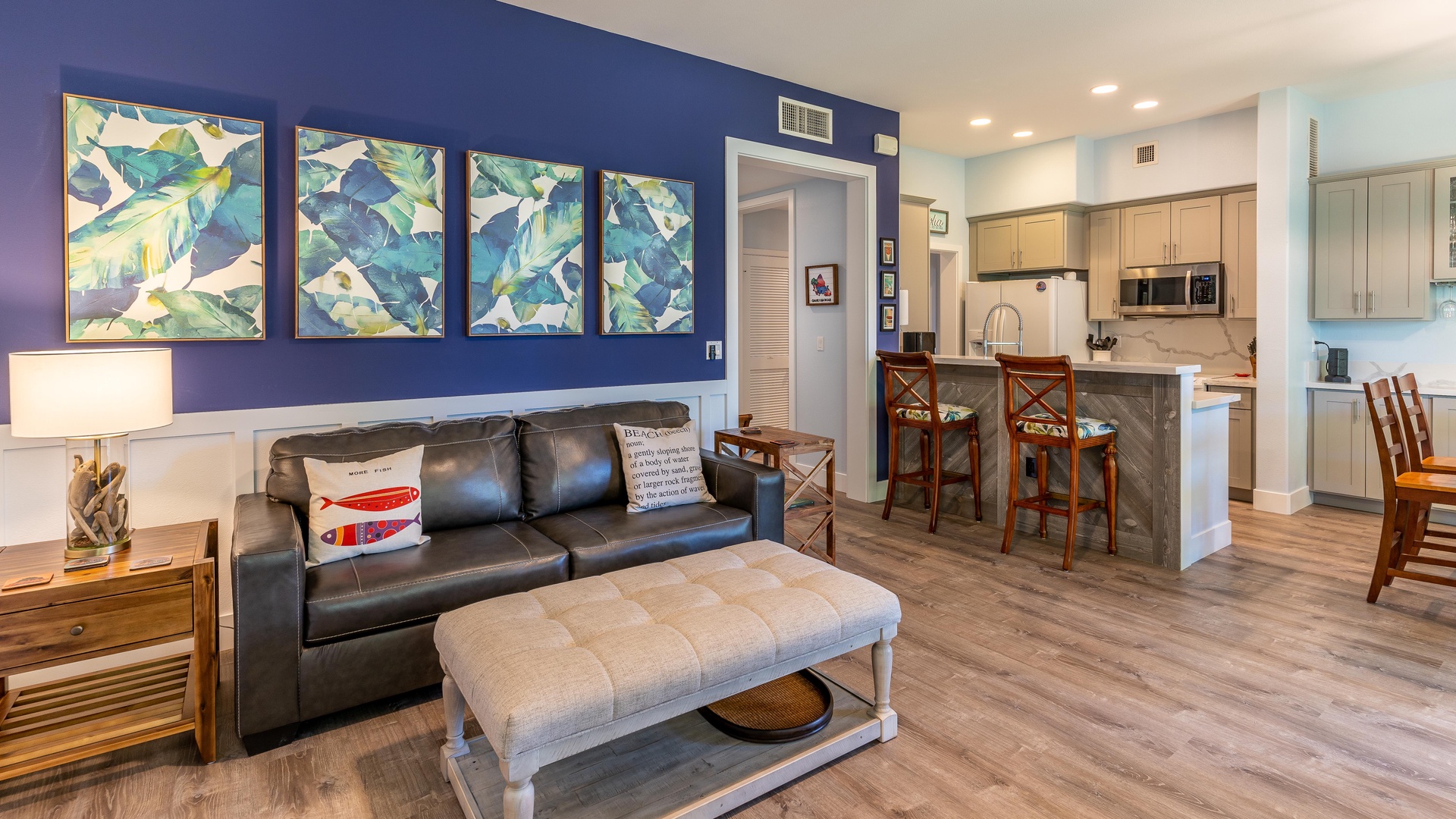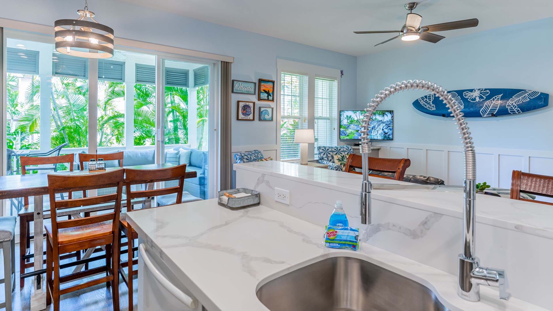 Slide back the glass doors and let tropical breezes join the open-plan living room, where ocean-inspired art, comfy seating, and smart TV invite easy downtime after a day on the water. A six-seat dining table anchors the space for island-fresh dinners or game nights.