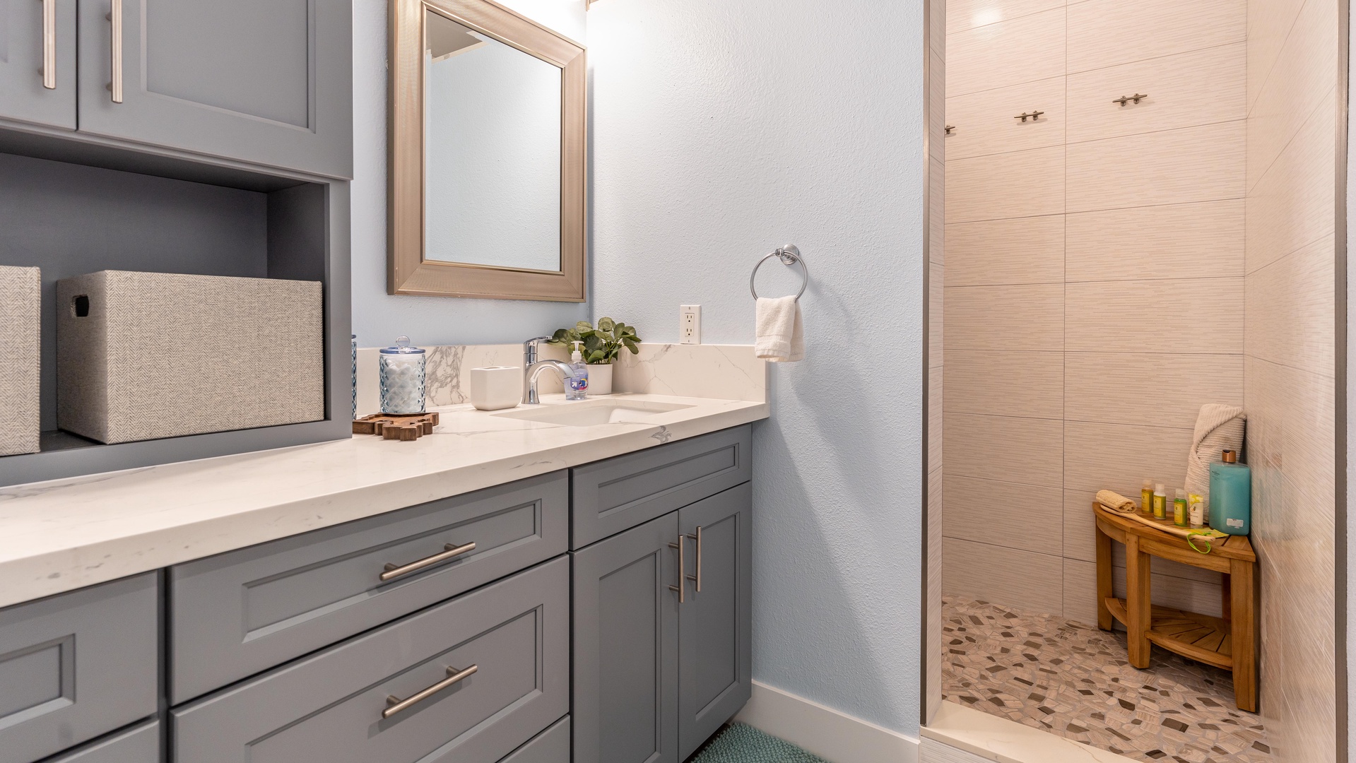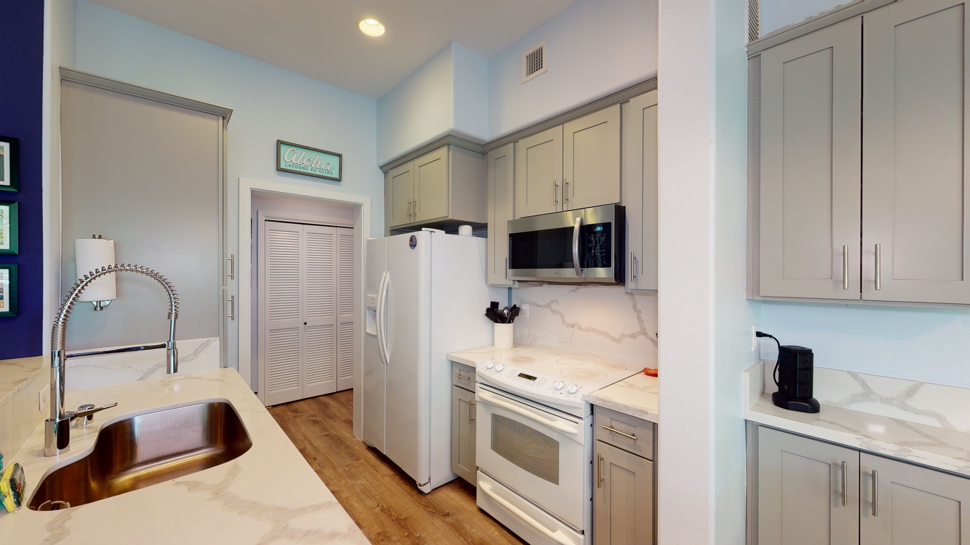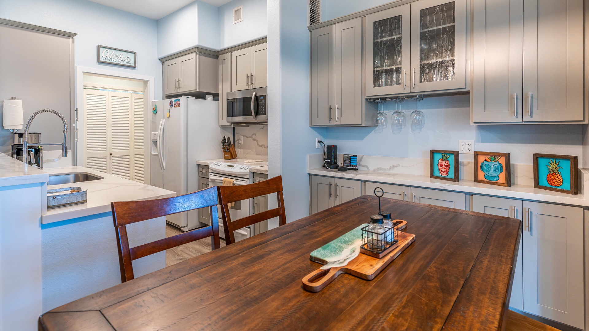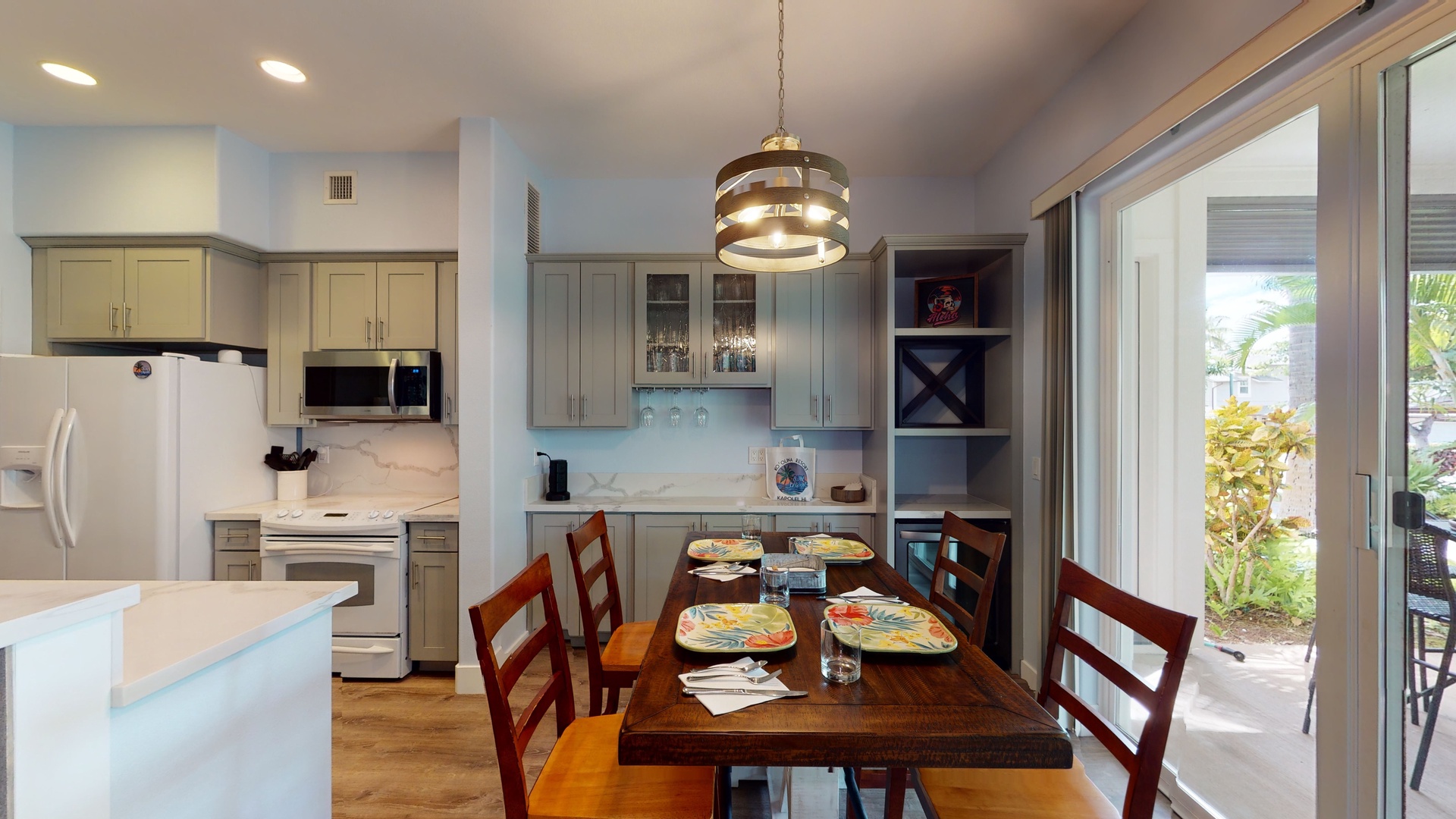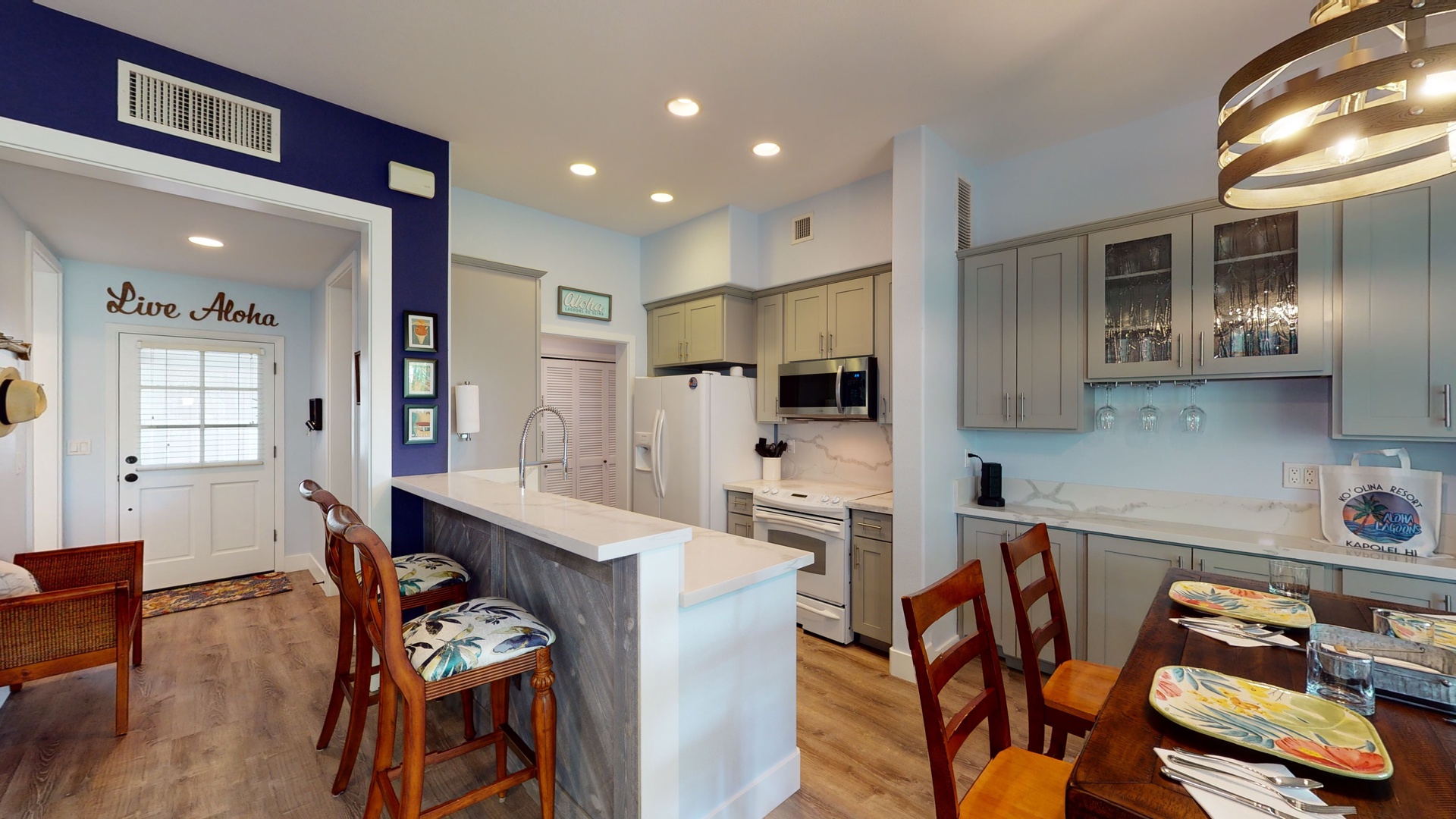 The brand-new kitchen gleams with stainless appliances, quartz waterfall island, and plentiful cookware. Whether blending açai bowls, brewing Kona coffee, or sautéing garlic shrimp, you’ll have every gadget you need.