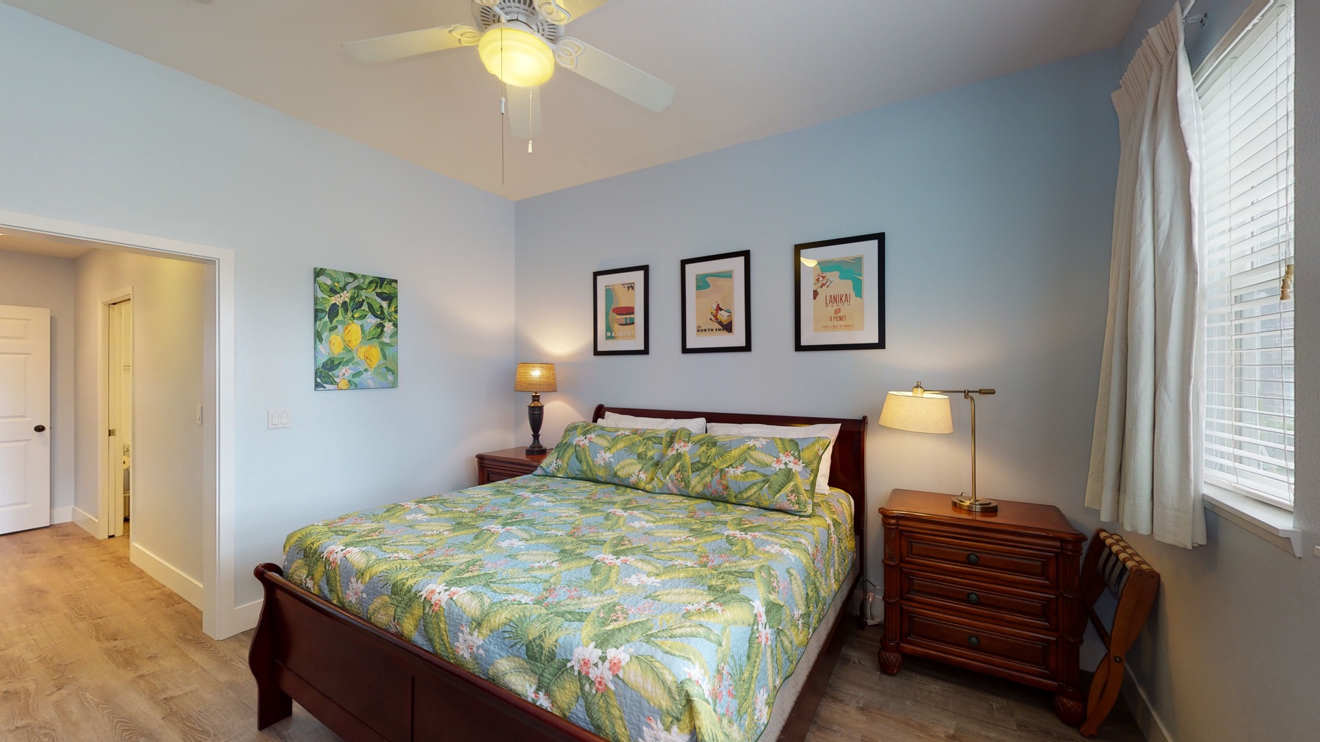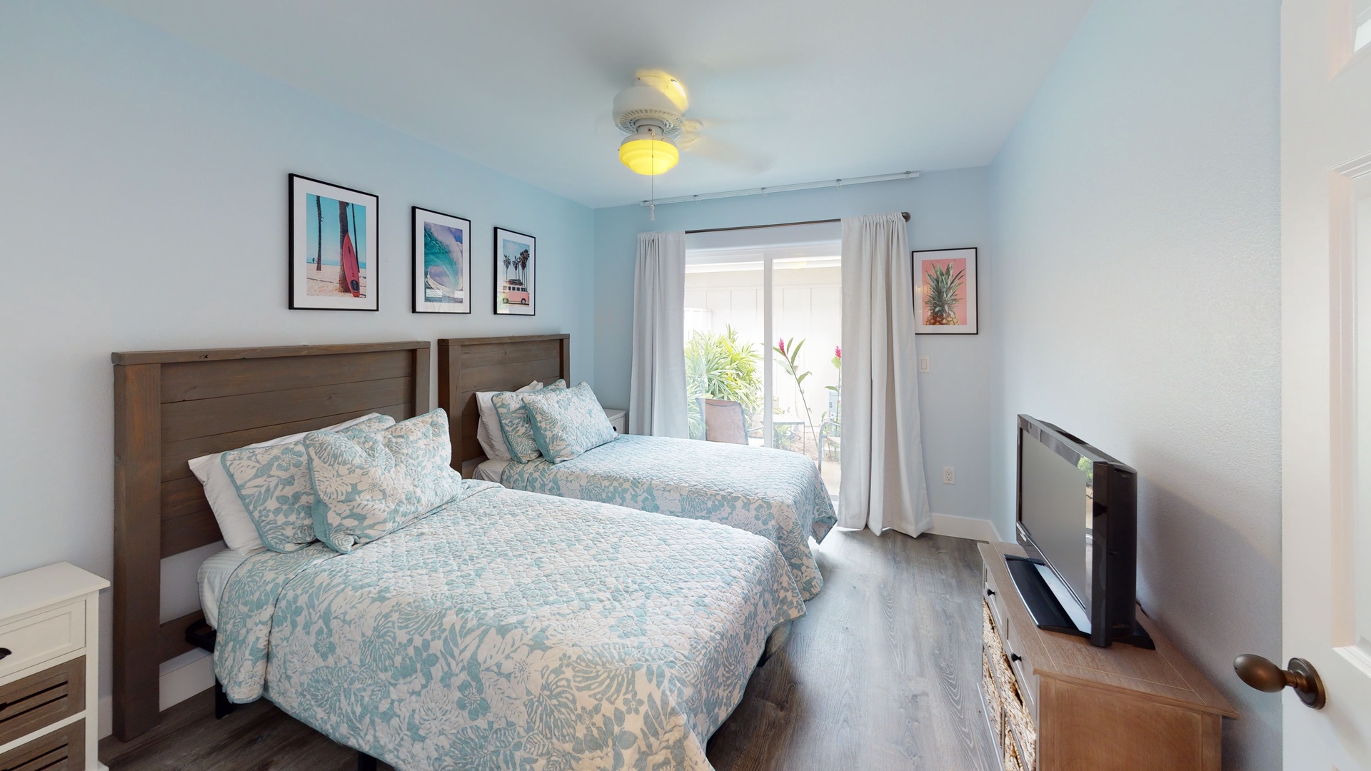 * Primary Suite – King bed, flat-screen TV, ceiling fan, direct lanai access, ensuite with walk-in shower