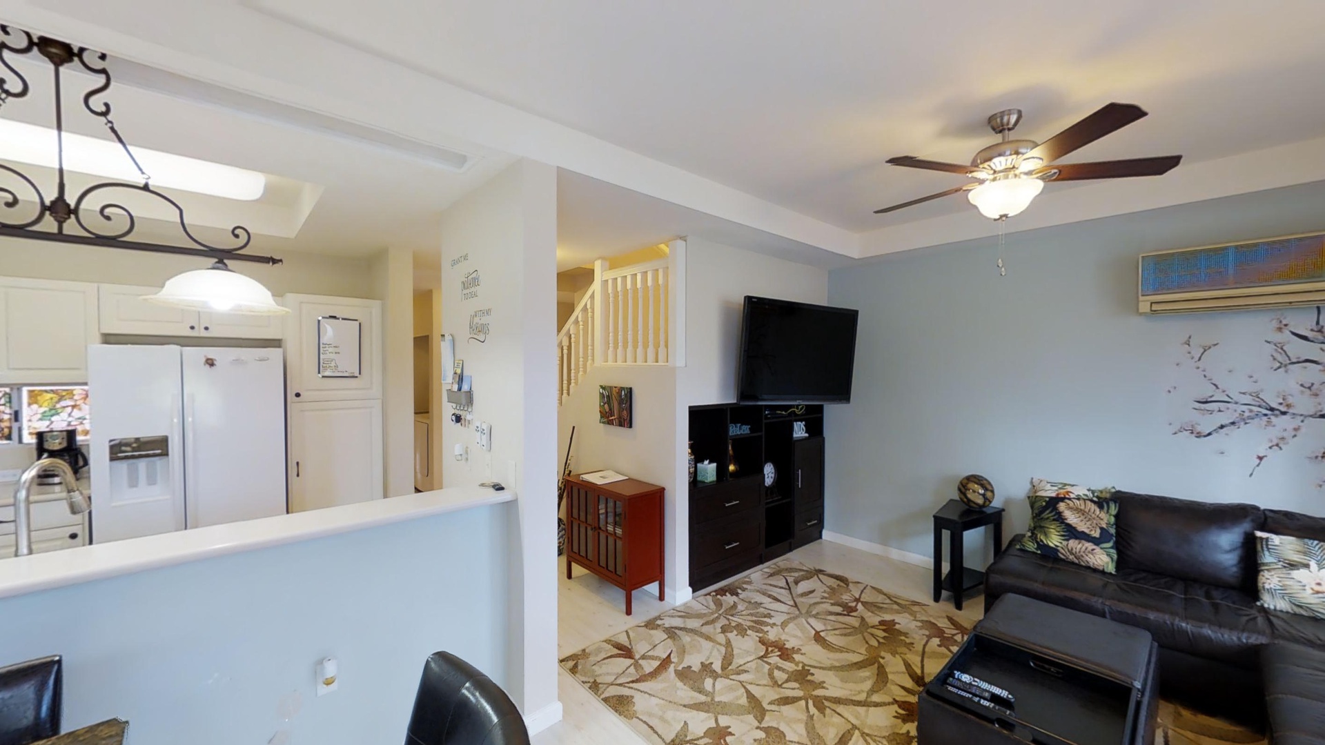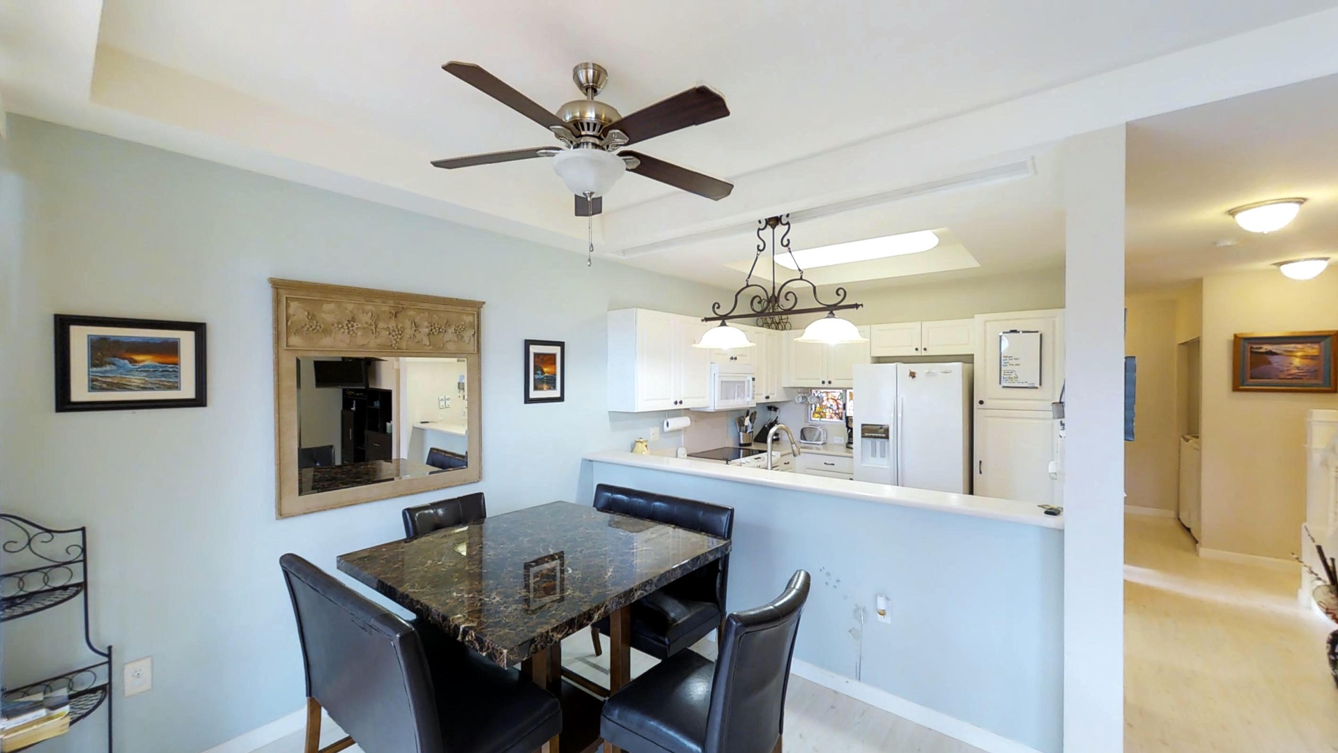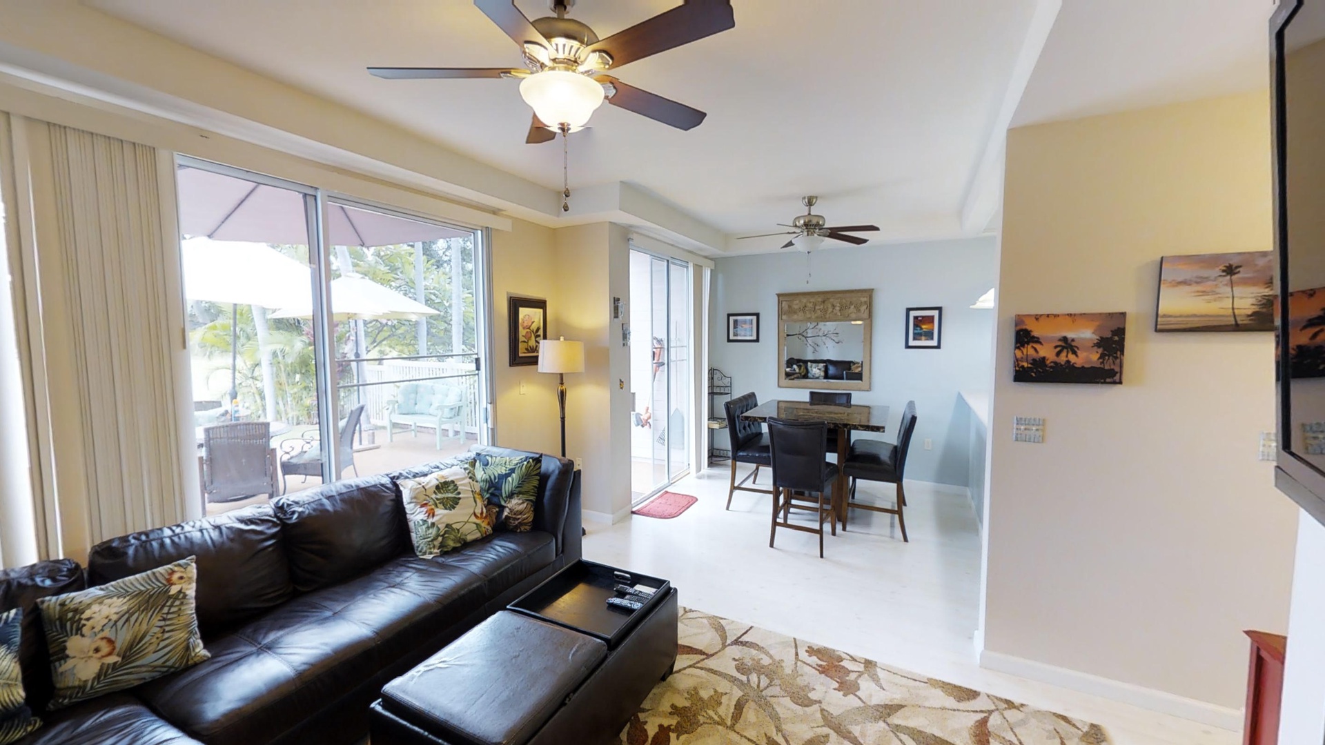 As you enter this perfect two-story vacation rental, you'll be greeted by wood laminate floors and a spacious living area. The large flat screen TV invites you to unwind after a day of exploration. The condo features a fully equipped kitchen with new appliances, making it a breeze to prepare your favorite meals. Whether you're enjoying breakfast at the dining area or sipping coffee on the huge lanai, you'll appreciate the tranquility of this home.