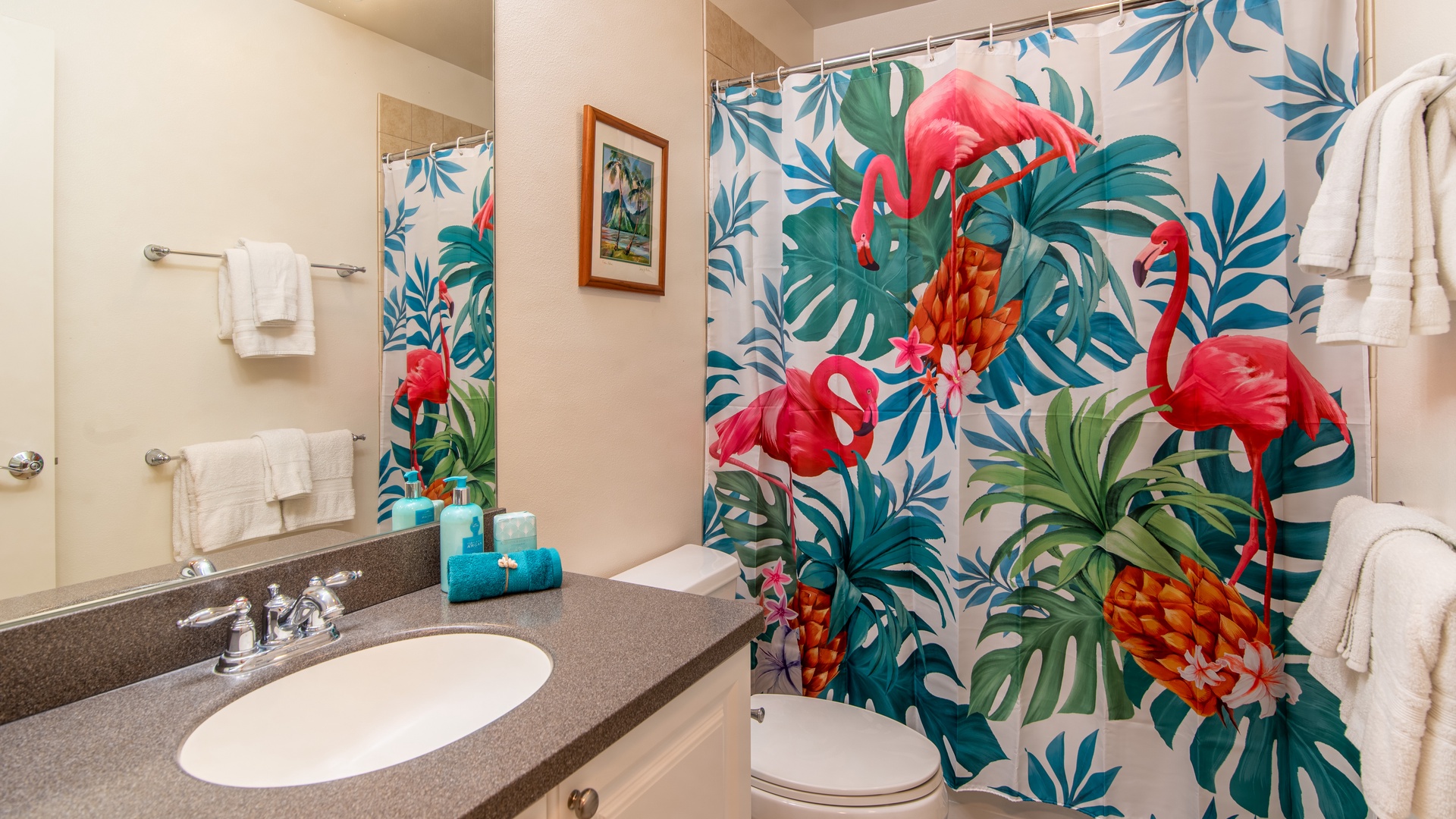 As you enter the villa, the welcoming entryway leads you to a convenient first-floor powder room, situated next to high-efficiency front-loader washing machines. This layout provides practicality and ease for all your laundry needs throughout your stay.