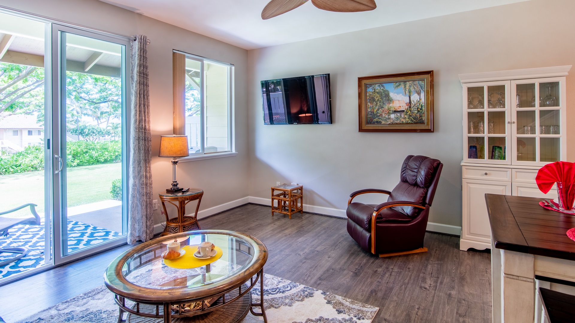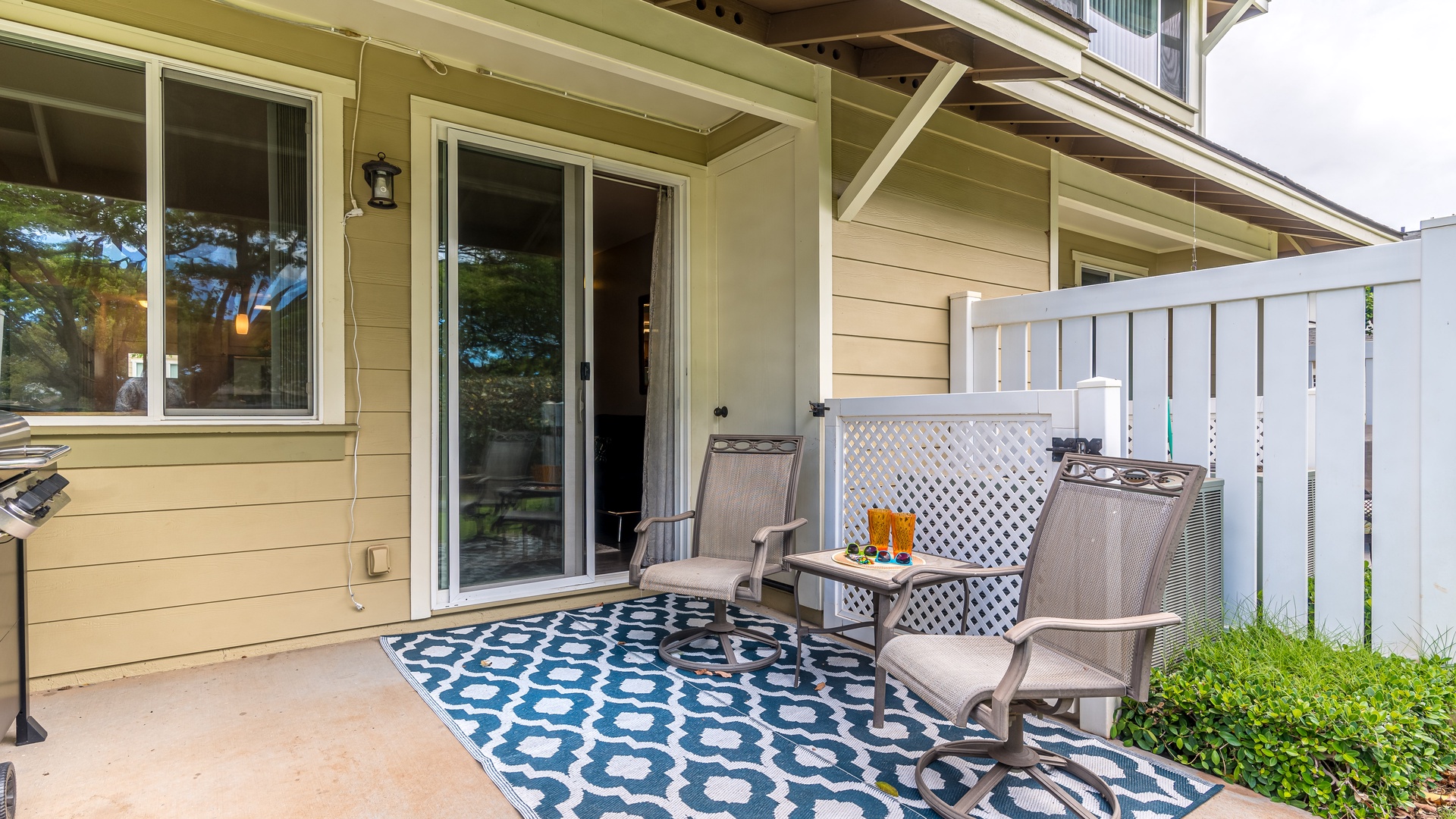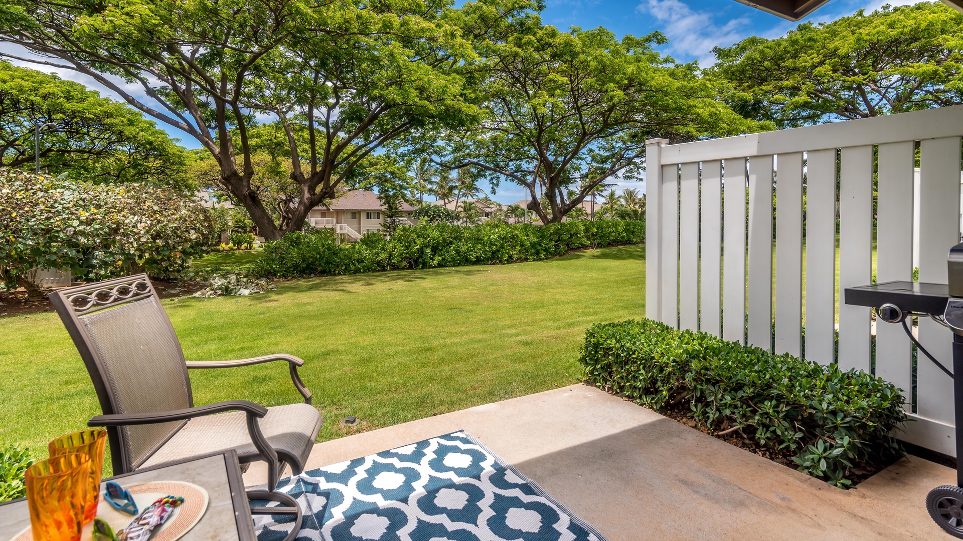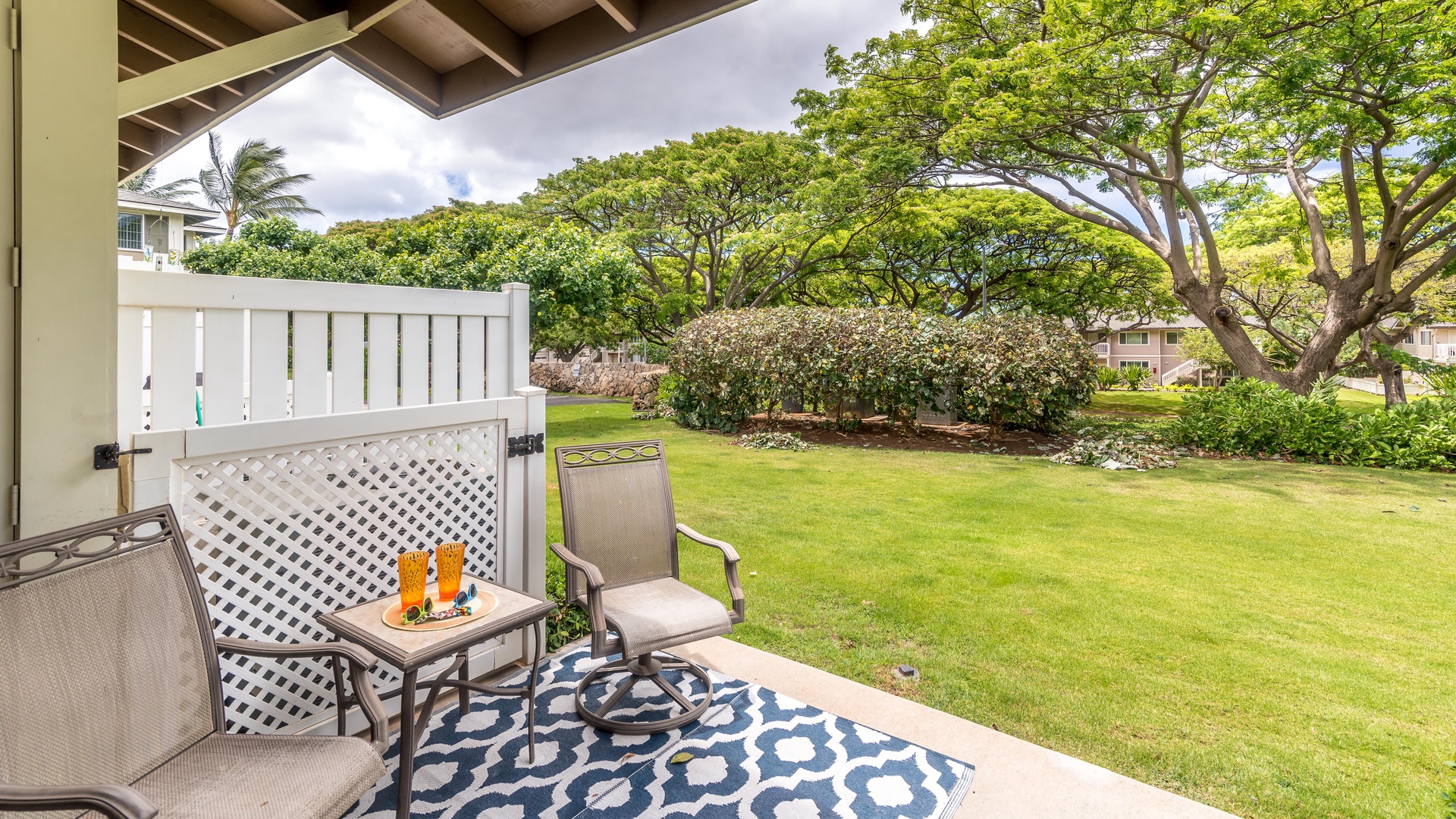 Step through the sliding glass doors onto the lanai, complete with a brand new apple-red gas grill and ample outdoor seating. The lanai opens onto a large shared lawn, providing a peaceful and serene setting for outdoor grilling, dining, or simply soaking in the Hawaii atmosphere.