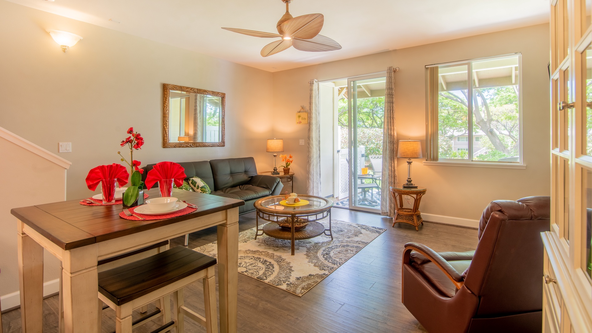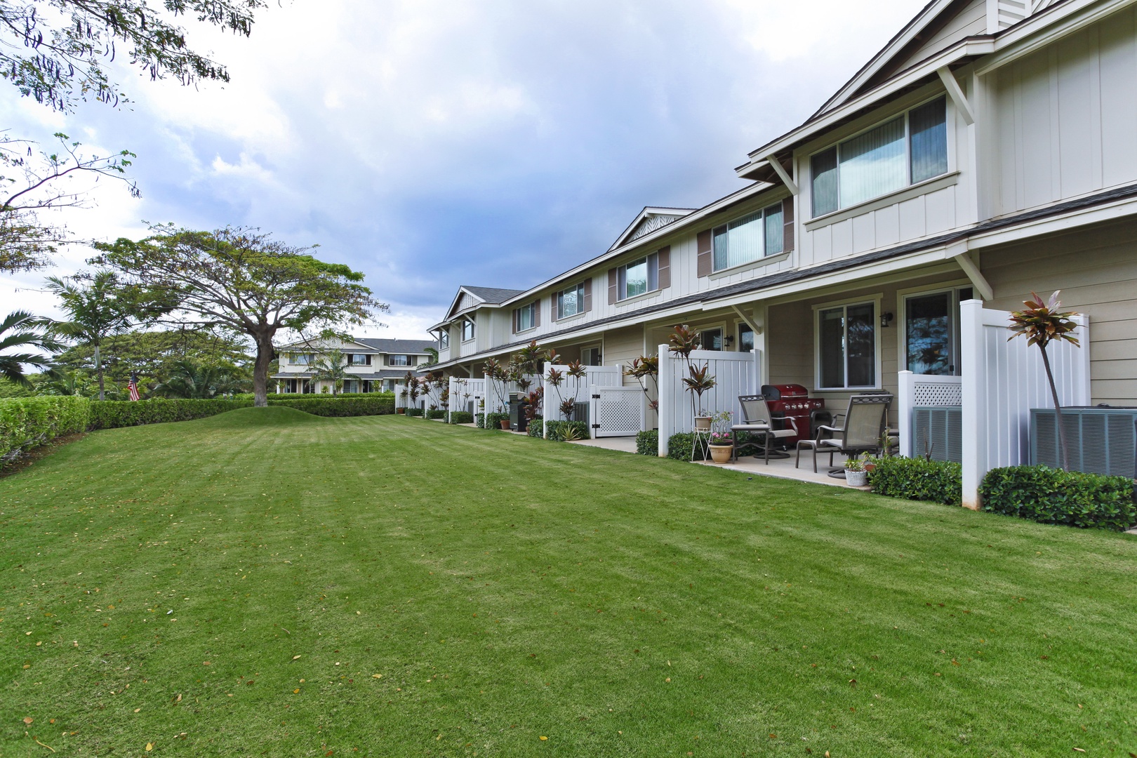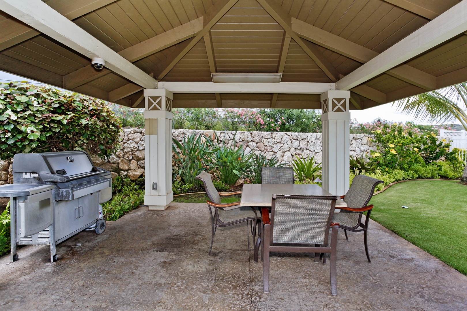 Step through the sliding glass doors onto the lanai, complete with a brand new apple-red gas grill and ample outdoor seating. The lanai opens onto a large shared lawn, providing a peaceful and serene setting for outdoor grilling, dining, or simply soaking in the Hawaii atmosphere.