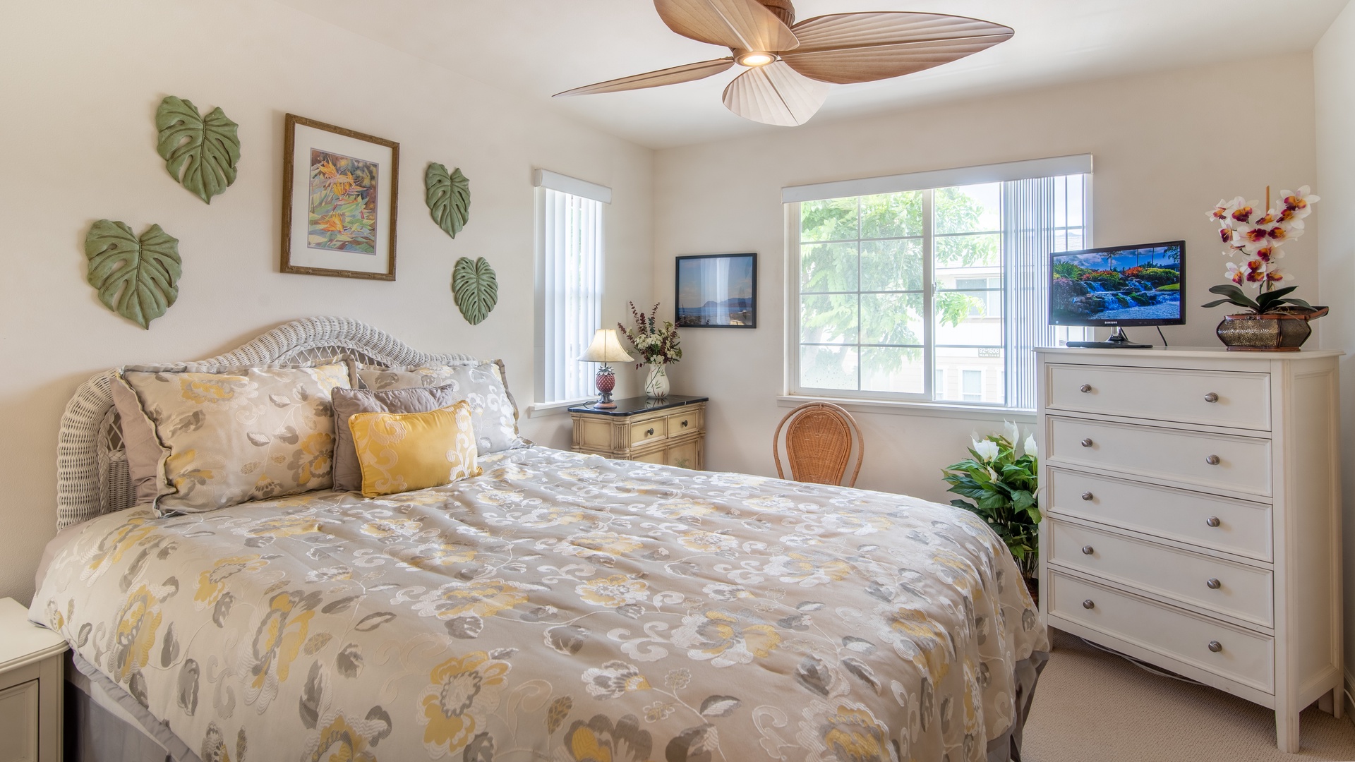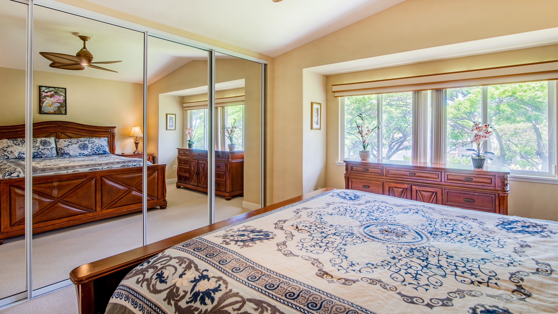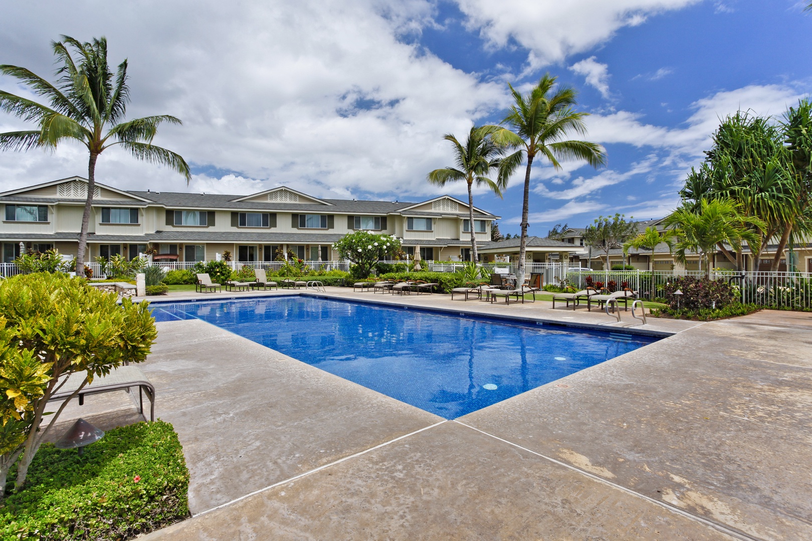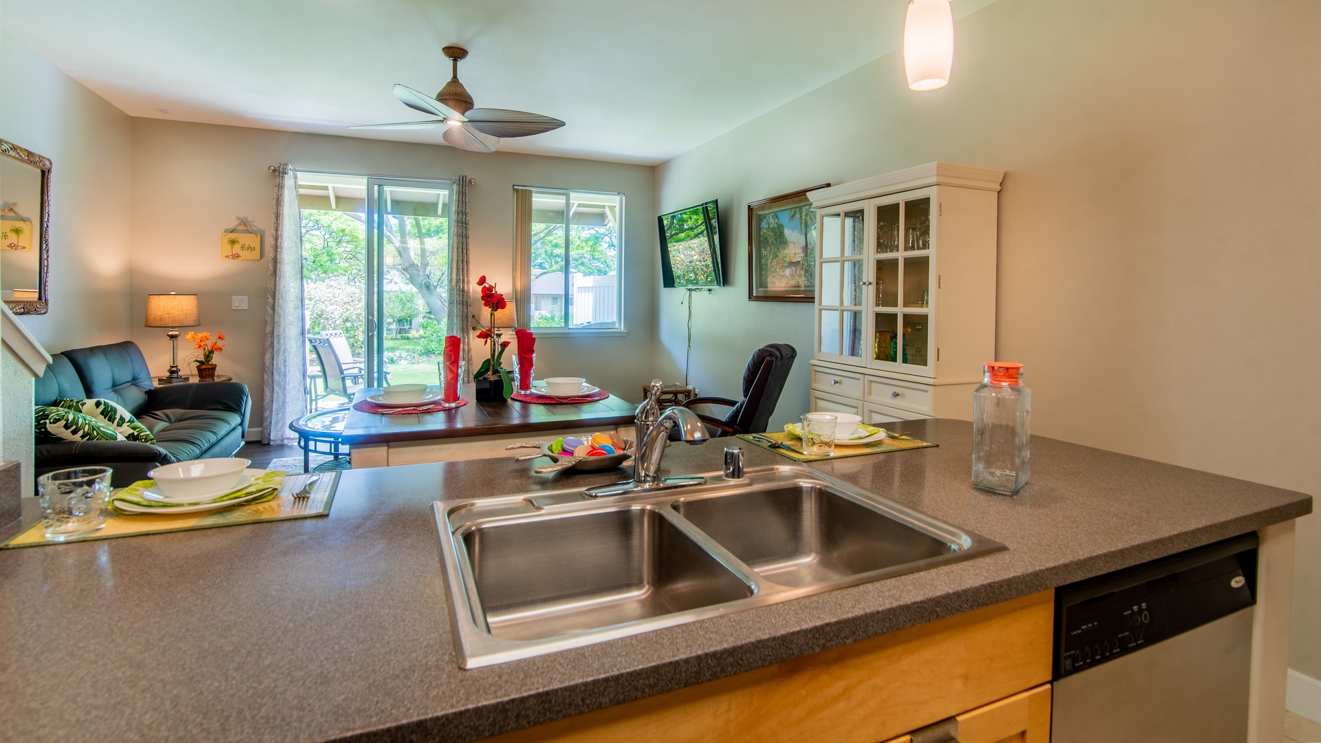 Step through the sliding glass doors onto the lanai, complete with a brand new apple-red gas grill and ample outdoor seating. The lanai opens onto a large shared lawn, providing a peaceful and serene setting for outdoor grilling, dining, or simply soaking in the Hawaii atmosphere.