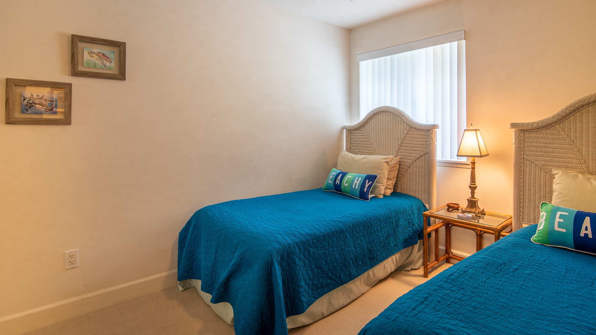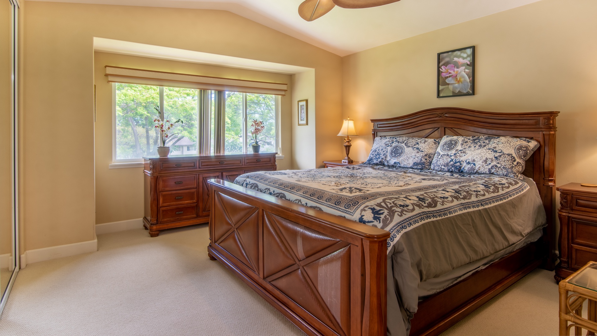 Upstairs, the villa continues to impress with its accommodation. The bright guest room, featuring a queen bed and flat-screen TV, offers both style and comfort. A second guest room with two twin beds and spacious mirrored closets is perfect for additional guests or children. The villa's highlight is the primary bedroom: a spacious king room with vaulted ceilings, a large mounted flat-screen TV, and high-end solid wood furniture. It also includes a massive closet with sliding mirror doors and an additional linen closet. The en-suite primary bathroom features a beautiful vanity and shower, complemented by a guest bathroom equipped with both a shower and a tub.