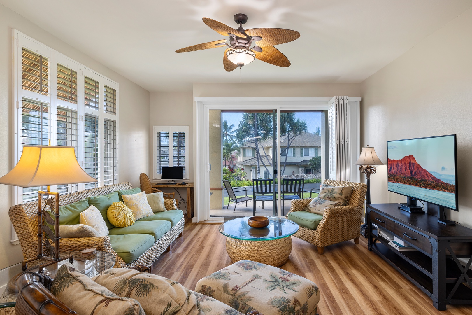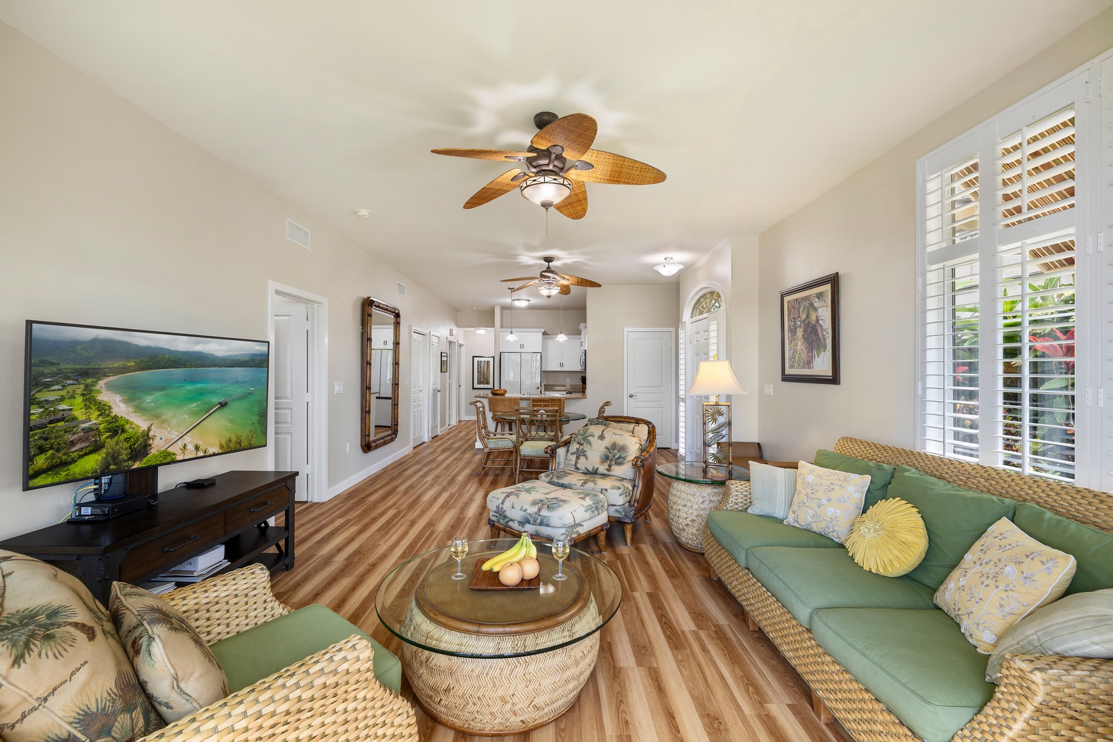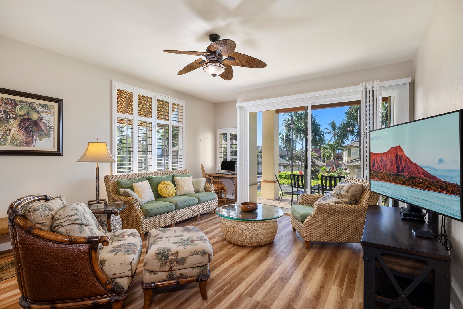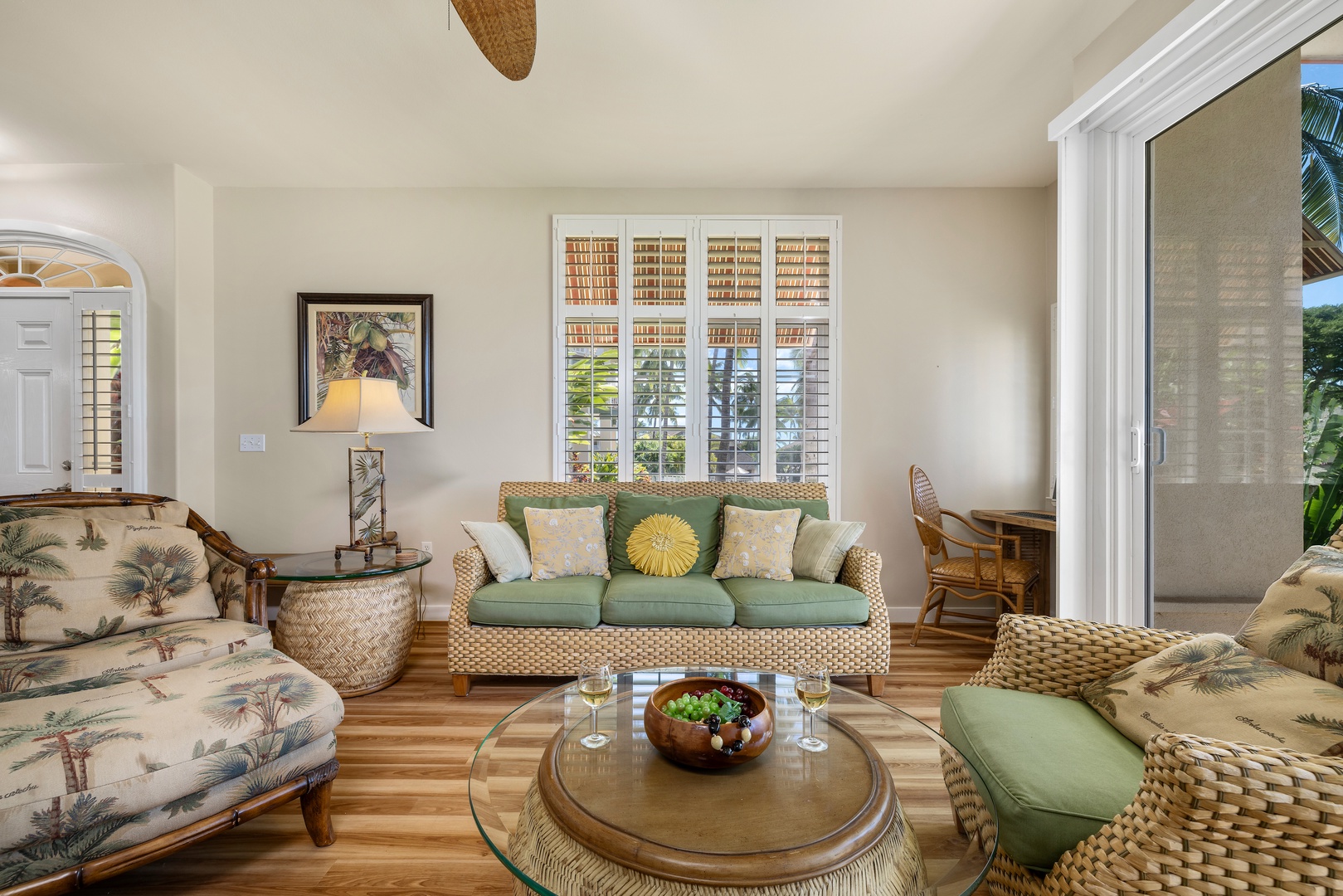 Step inside this inviting home to discover a bright and airy living area filled with natural light from large windows that frame the tropical surroundings and ocean view. The spacious living room is perfect for relaxing after a day of island adventures, offering comfortable seating and entertainment options for your group.