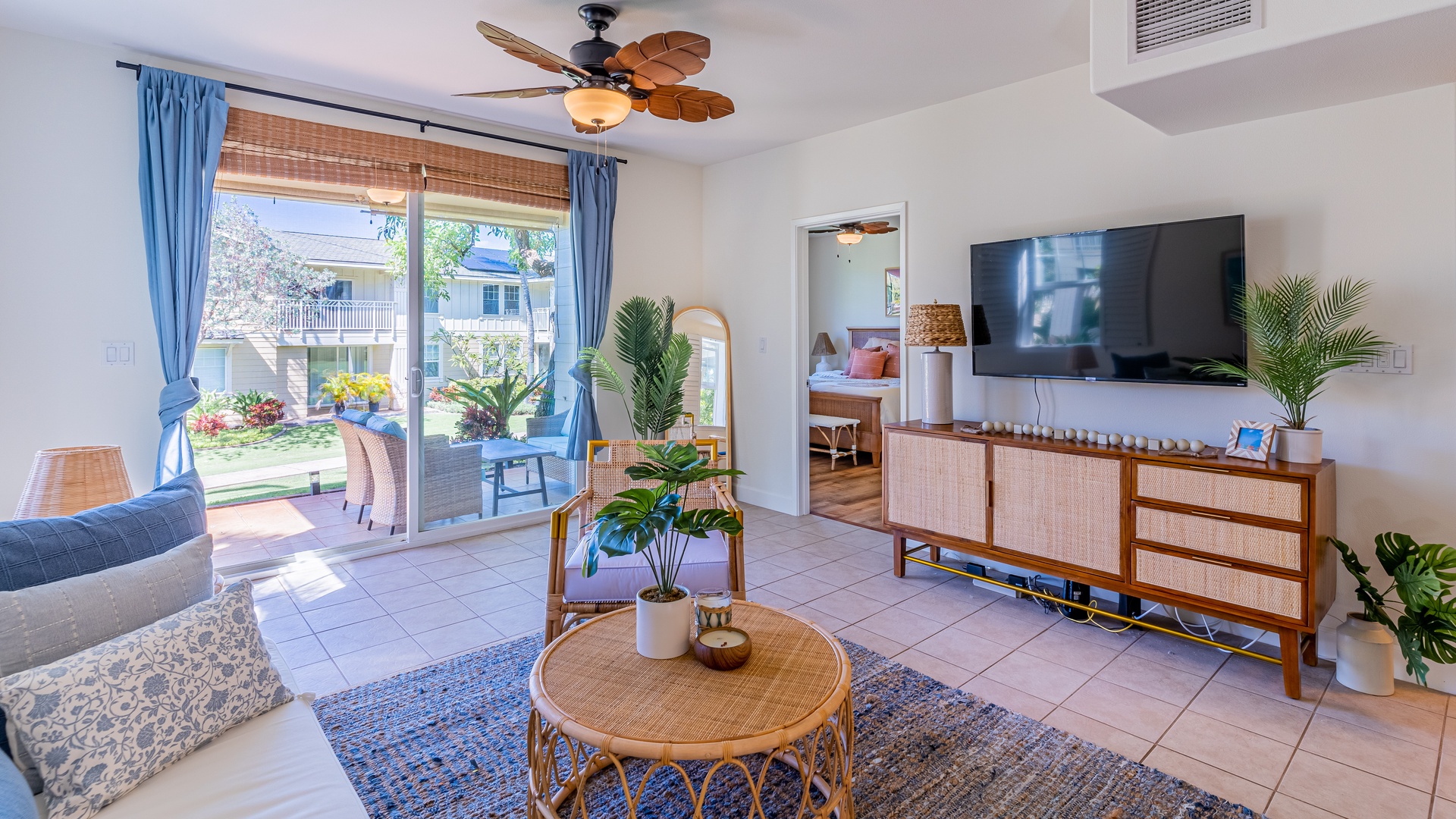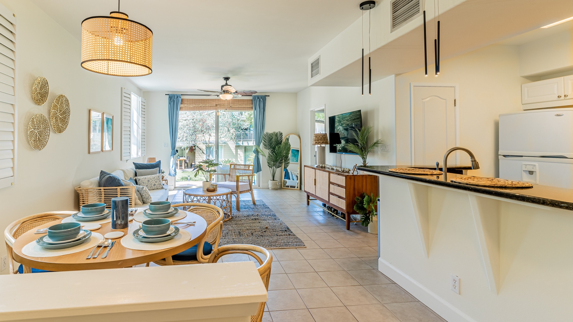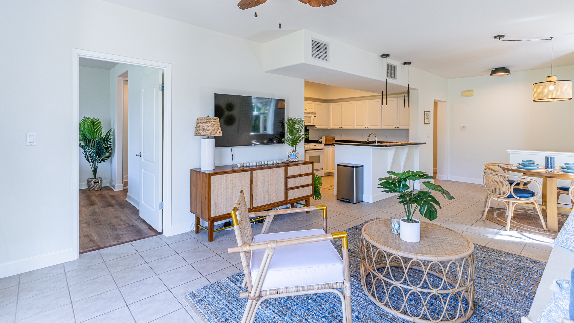 As you step into this bright, white space, you are greeted by an open living, dining, and kitchen plan that exudes a welcoming atmosphere. Plentiful windows, including sliders from the living area to the private lanai, allow natural light to flood the space, creating a cheerful and inviting environment. The living area, with a tropical design and modern touches, includes comfortable seating and a flat-screen TV, perfect for relaxation and entertainment.