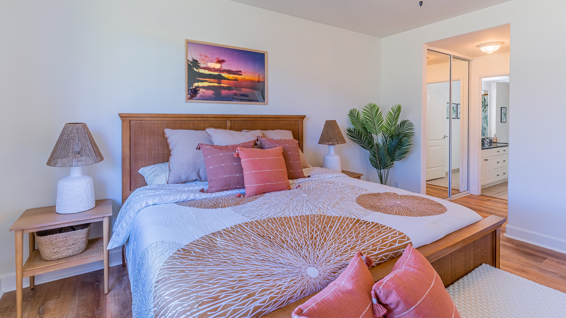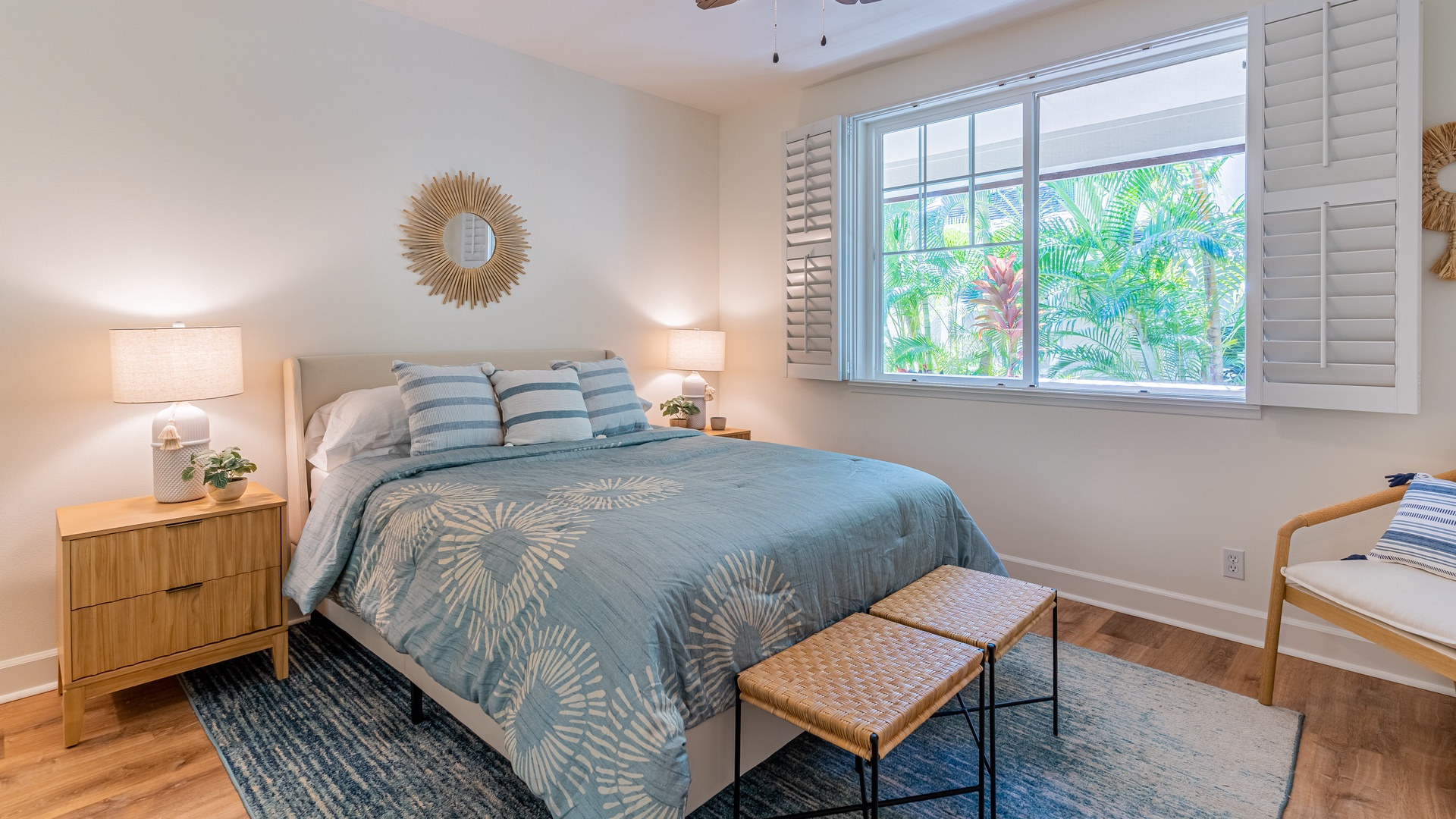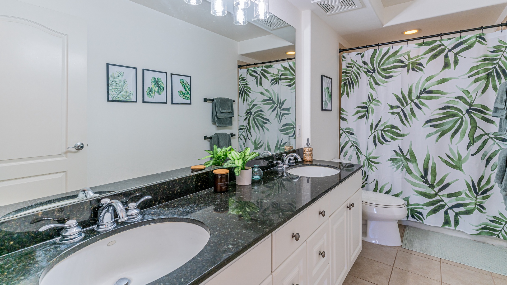 The primary bedroom features wood flooring and a ceiling fan, ensuring comfort and a good night's sleep. The ensuite bathroom boasts a dual vanity and a shower-tub combo, adding luxury and convenience. The guest bedroom, equipped with a cozy queen bed and offering tropical views, provides a tranquil retreat for additional guests. The adjacent guest bathroom, also with a tub-shower combo, ensures privacy and ease for everyone staying in the condo.