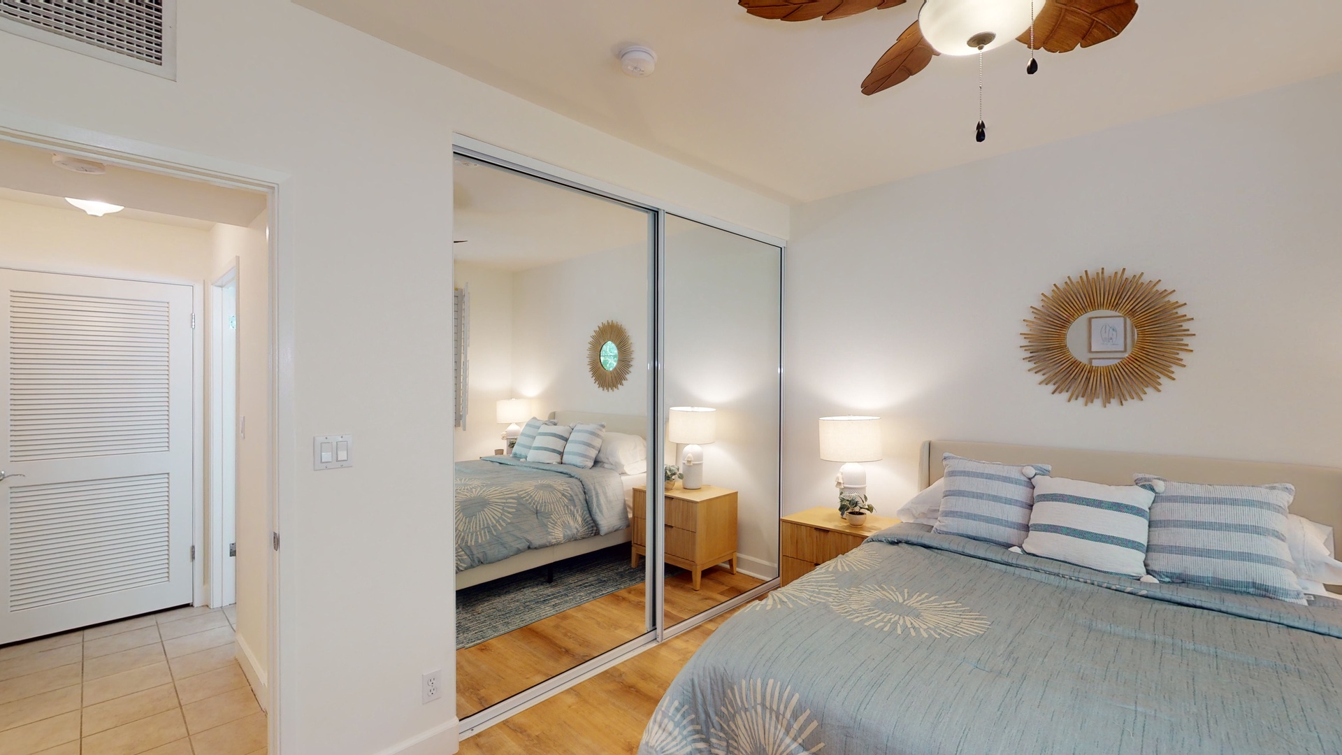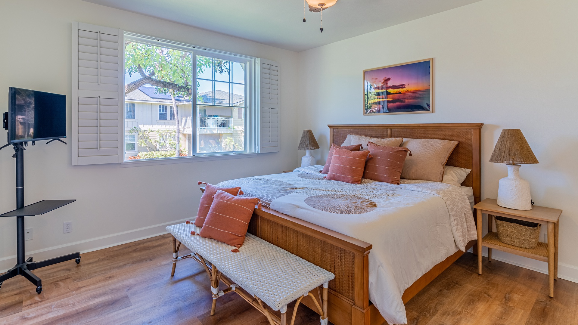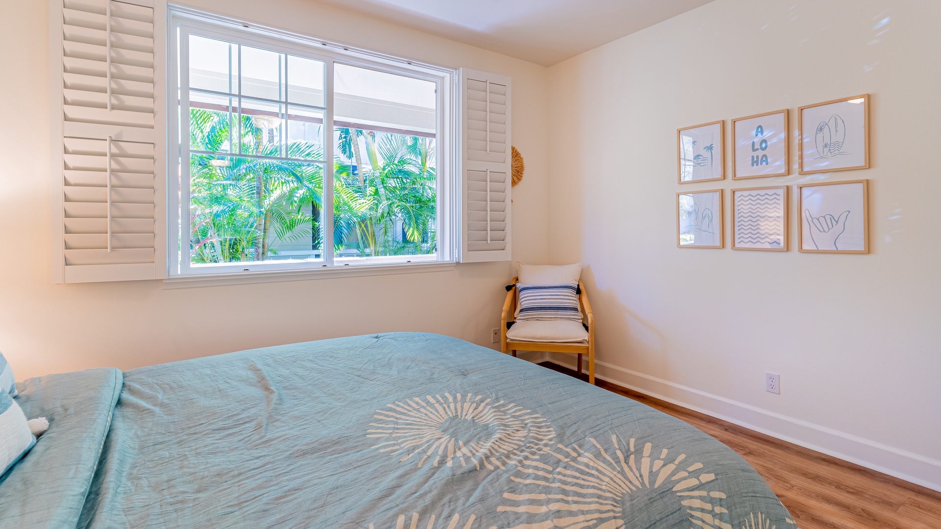 The primary bedroom features wood flooring and a ceiling fan, ensuring comfort and a good night's sleep. The ensuite bathroom boasts a dual vanity and a shower-tub combo, adding luxury and convenience. The guest bedroom, equipped with a cozy queen bed and offering tropical views, provides a tranquil retreat for additional guests. The adjacent guest bathroom, also with a tub-shower combo, ensures privacy and ease for everyone staying in the condo.
