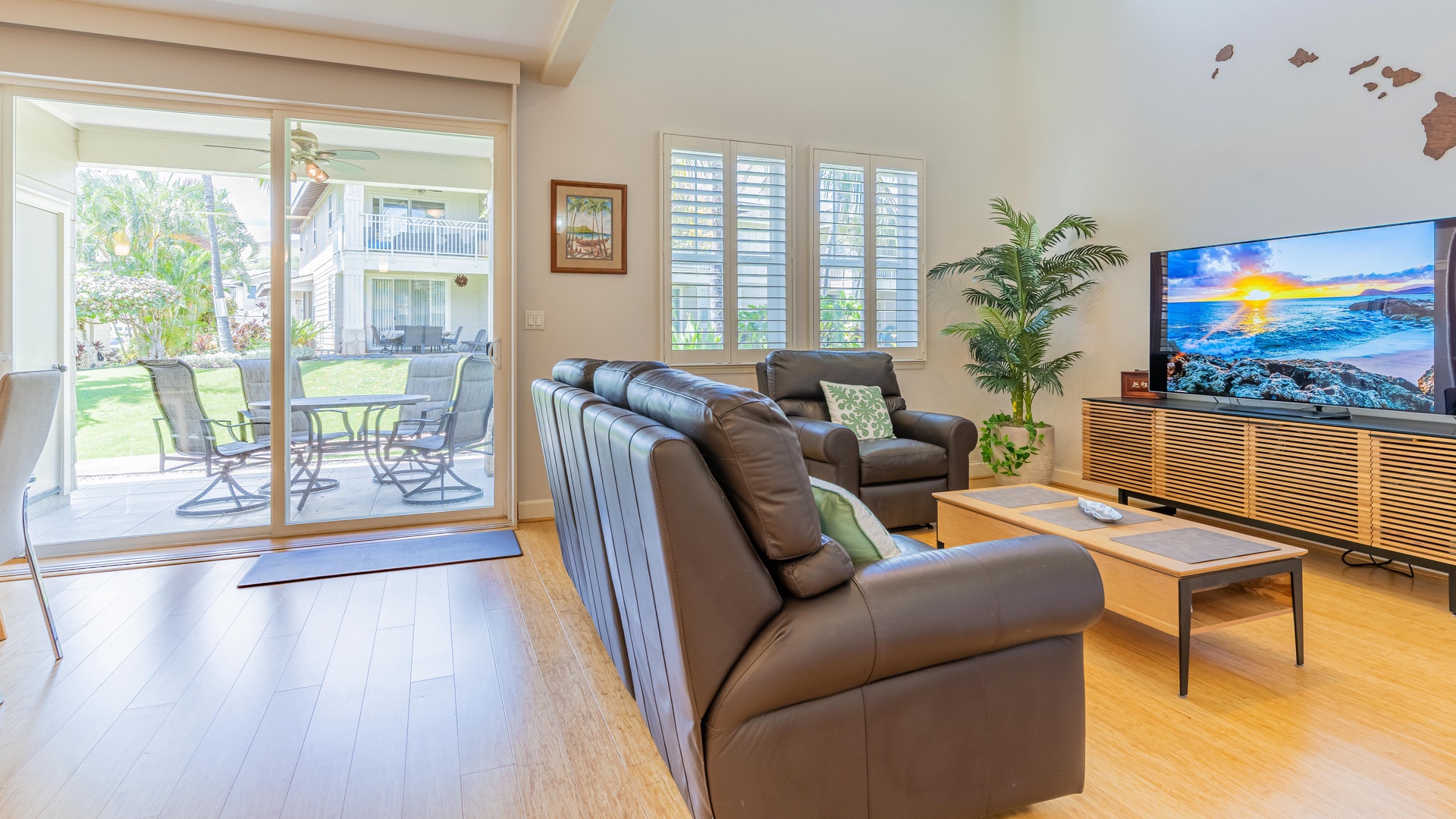 As you step inside, you're immediately welcomed by an open floor plan that seamlessly connects the kitchen, dining, and living areas. The living room, adorned with comfortable modern furniture and a large TV, is ideal for relaxation or entertainment. Sliders open up to a private lanai, inviting you to enjoy the beautiful Hawaii outdoors in your own secluded area.
