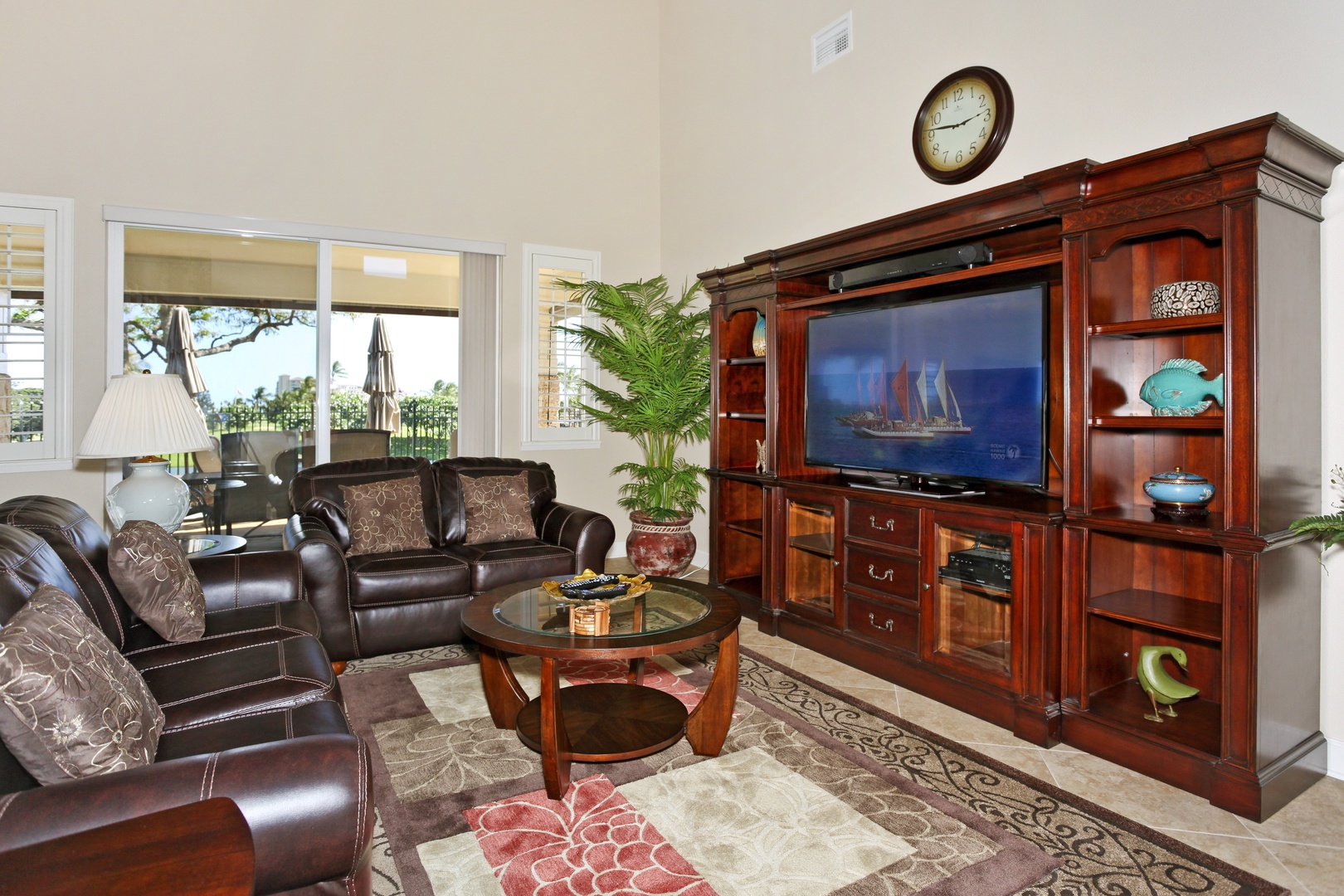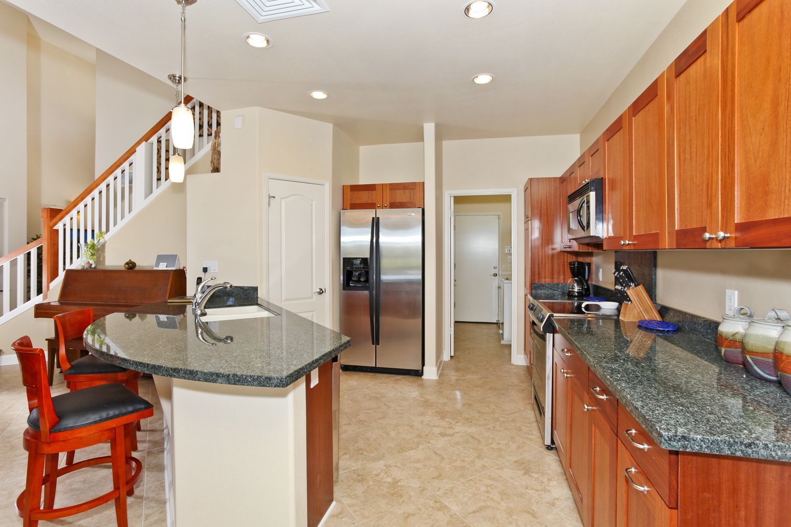 Located in the luxurious Ko Olina Golf Resort & Marina, this designer home offers the privacy and space you need with over 2000-sq. ft. of living space plus large lanai and yard with golf course frontage. This beautifully landscaped property offers first class furnishings with timeless décor, stainless steel appliances, granite countertops in the kitchen and baths. The home is nicely appointed with tiled living areas and a great entertainment center. Enjoy cool trade winds or central air conditioning in a spectacular paradise resort home instead of a hotel. The open, airy feeling kitchen is fully equipped with cookware, beautiful dishes, etc. The living room with very spacious with vaulted ceilings and comfortable leather furnishings. There’s even a piano if you like to tickle the ivories! Enjoy dining at the indoor dining table or al-fresco on the lanai looking out at the golf course. Barbecue on the Weber gas grill on your lanai or enjoy the cabanas and grills at the recreation center while taking a dip in the lava rock pool or relaxing in the hot tub.