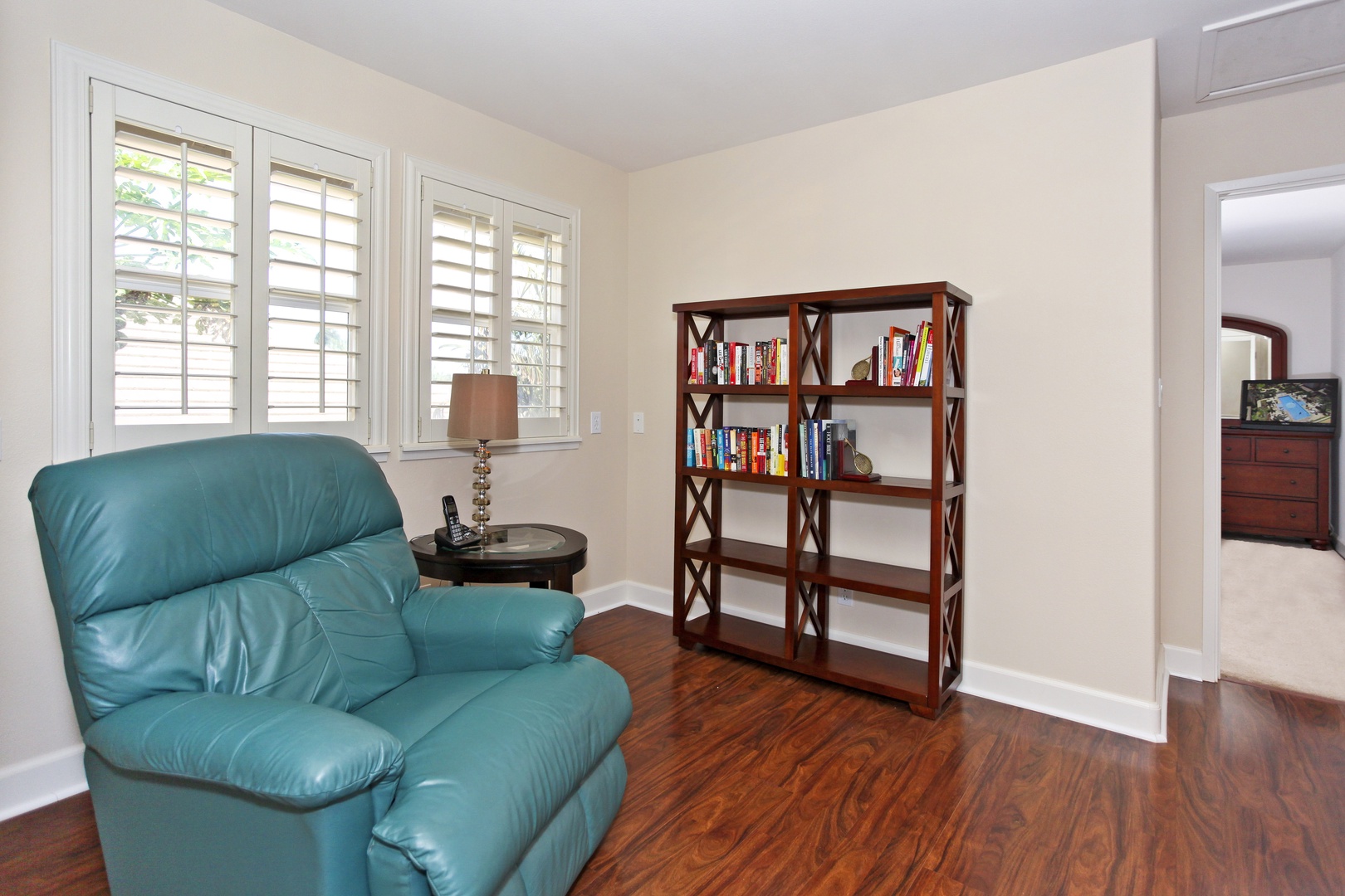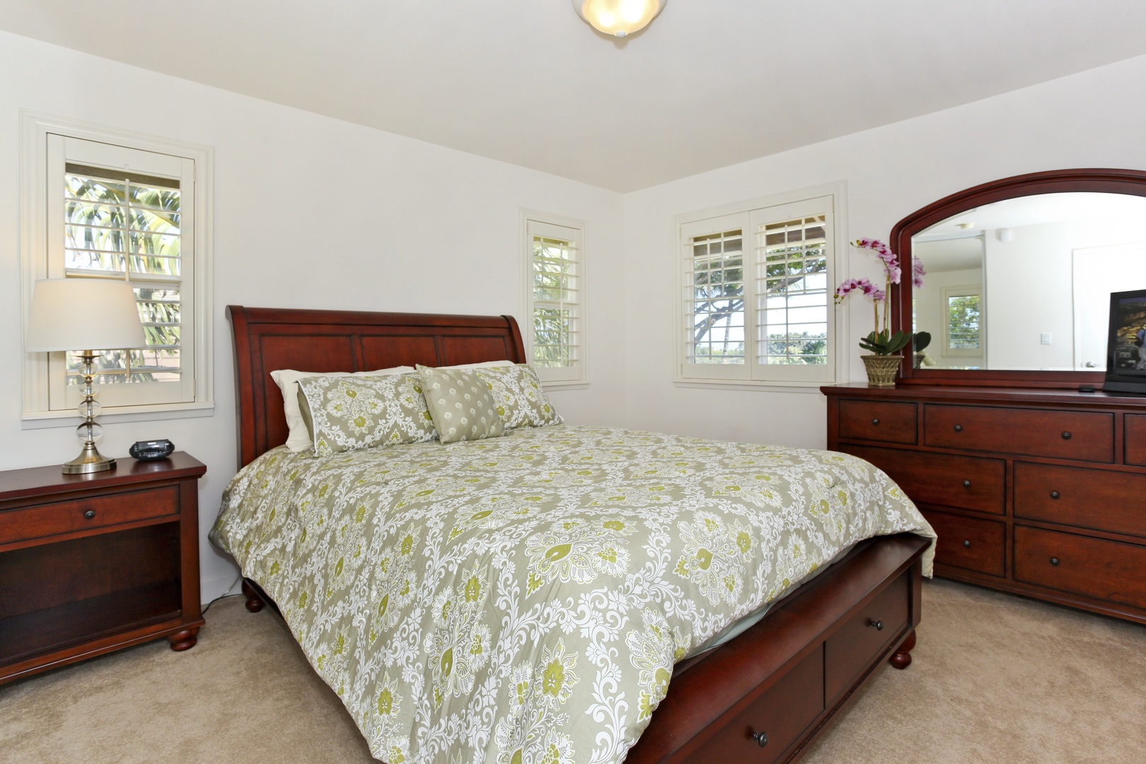 The master suite with King bed is located on the first floor with direct access to the lanai. A private master bath has double sinks, shower stall and sunken bath tub. A separate second full bath is located on the first floor. Two additional bedrooms with queen beds share a bath on the second level. There is also a lounge area on the upper landing with a leather recliner and a bookshelf. All bedrooms are nicely furnished. Plantation shutters and tropical artwork complement the rooms.